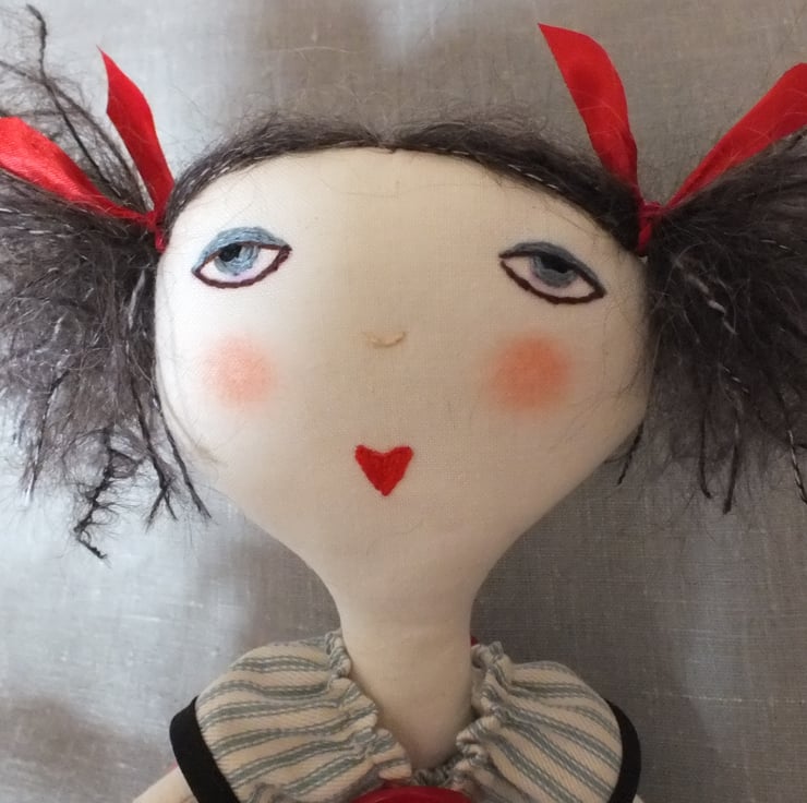 Her body ,head and arms are made from vintage linen and her legs and dress are made from cotton ticking fabric. She has embroidered features and her hair is mohair yarn - her bunches just seem to get bigger every time i look at her ! Her dress has a big old button both front and back and .... she is about 34cms tall .