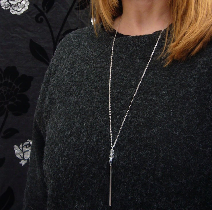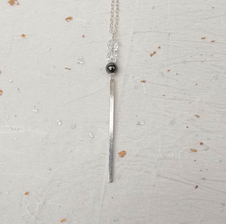 I have created this necklace by hand by cutting 2mm sterling silver square wire and attaching it to sterling silver chain with haematite and crystal beads. It has been designed by myself and is part of a collection of square wire jewellery.