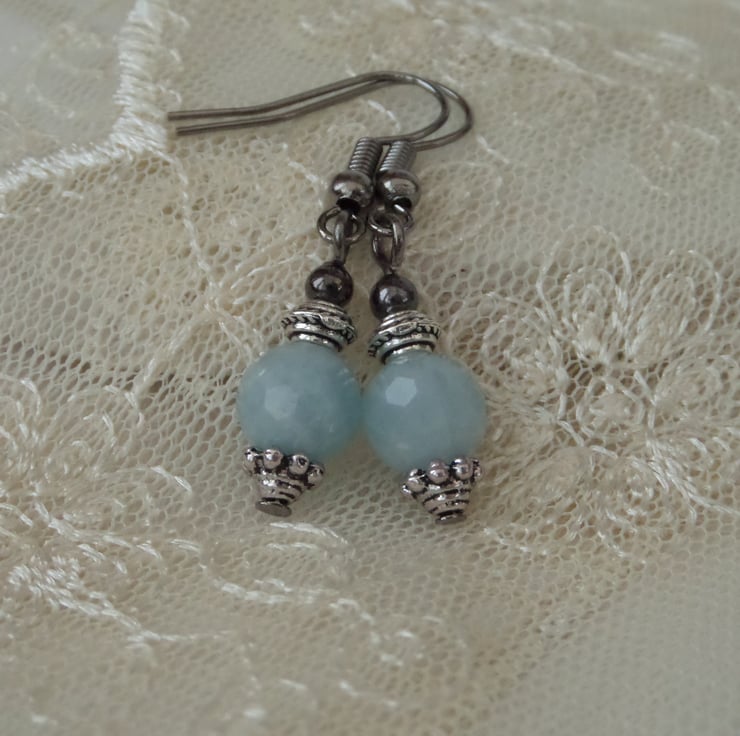 The faceting on these semi-precious aquamarine gemstones means that they catch the light, highlighting their colour and beauty.