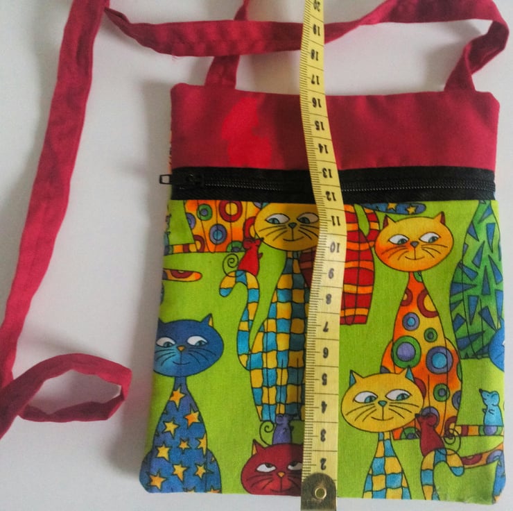 It has a zip closure and measures approx 13cm wide x 16cm high with a handle length of 130cm