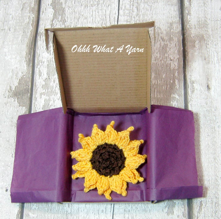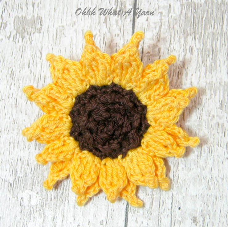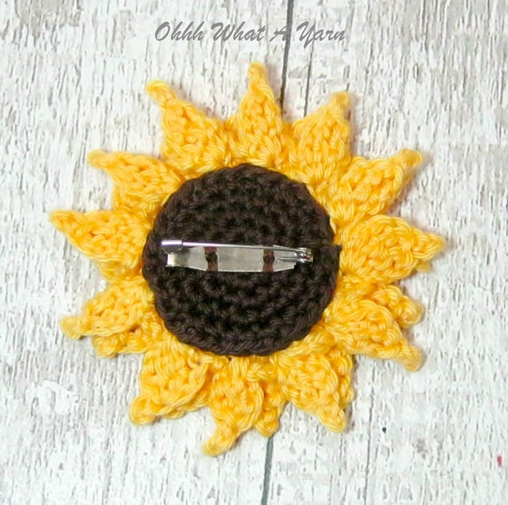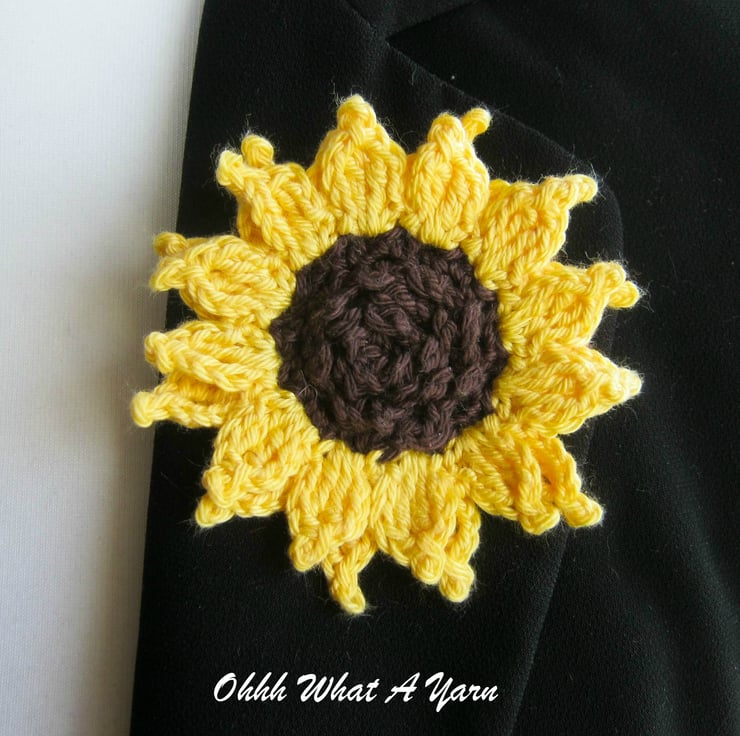 This pretty and cheerful sunflower brooch has been crocheted with Scheepjes Catona mercerised cotton yarns which gives it a lovely sheen and stitch definition.