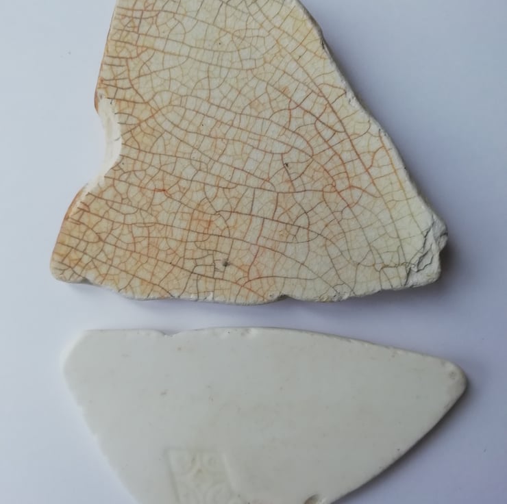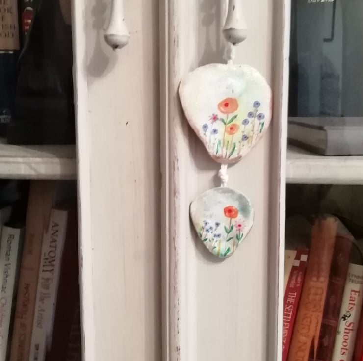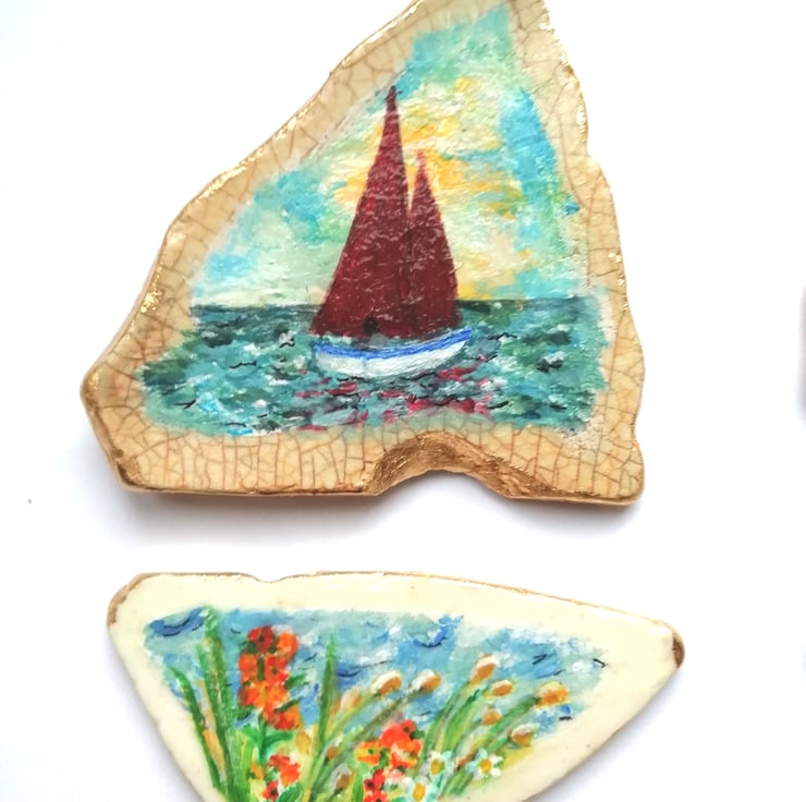 These pieces of sea pottery from the Kent coast are smoothed by the sea. I have painted a view from the beach in spring. The edges are gilded in gold leaf and sealed with shellac. It hangs on a 21cm finger knitted cord.