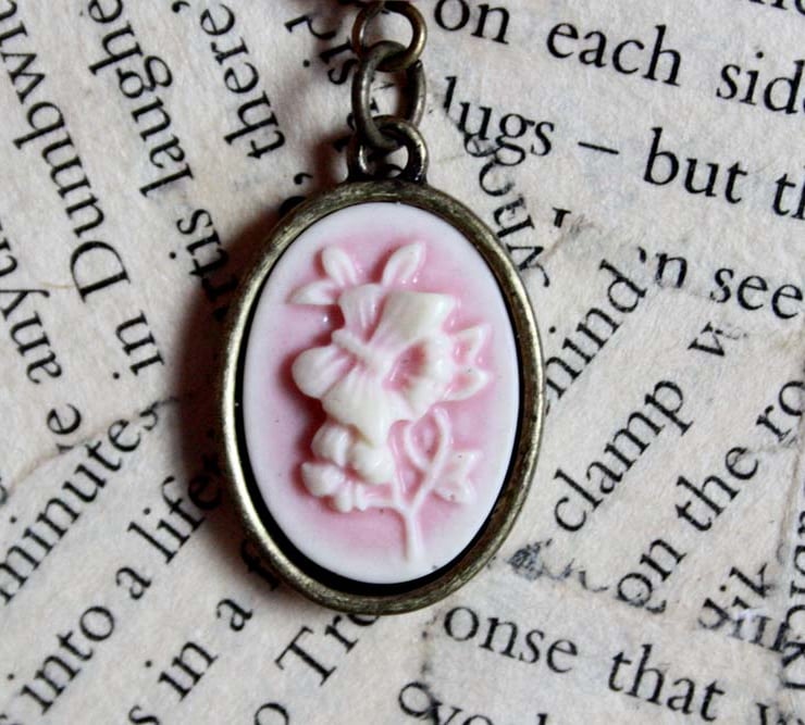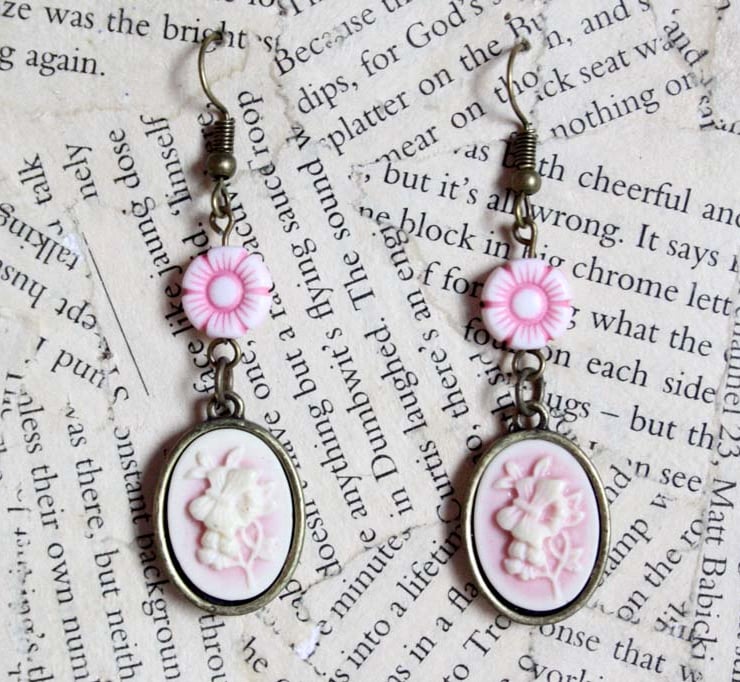 The cameo charms feature a delicate floral design with butterfly. They hang from pink and white flower beads.