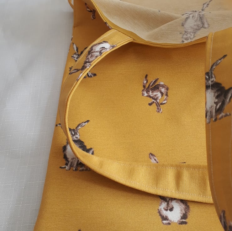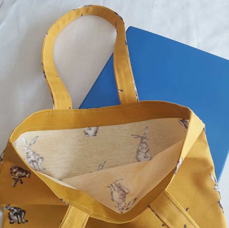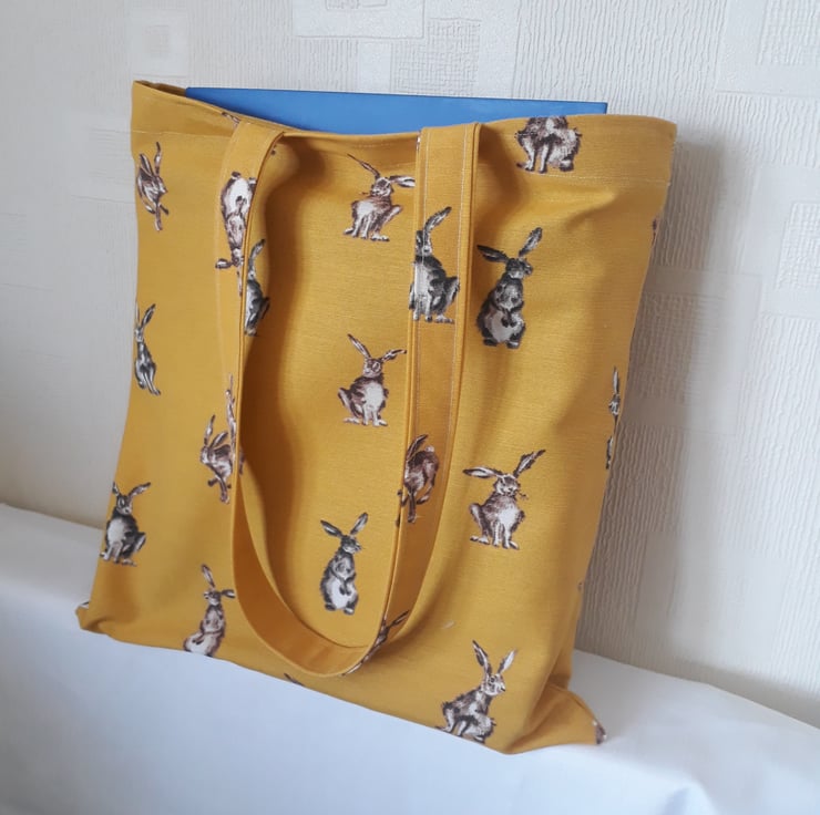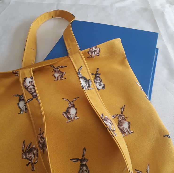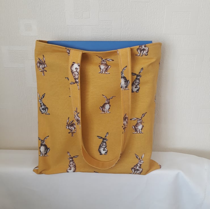 I have designed and made a tote bag using a beautiful linen mix hare printed fabric. The fabric bag has two long handles for shoulder wear. The bag is large enough to pop an A4 folder inside.