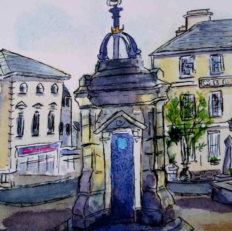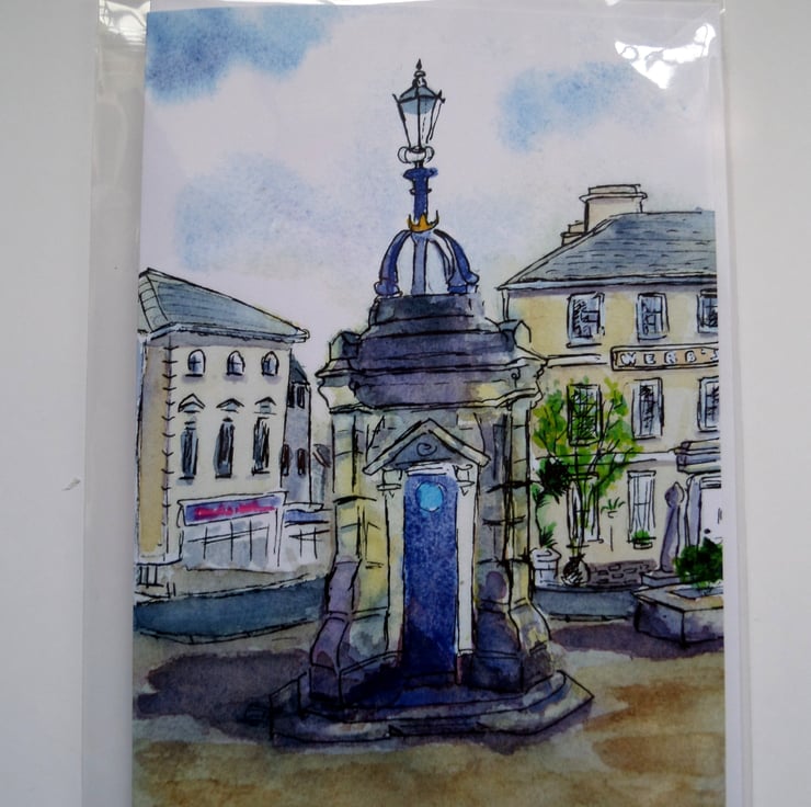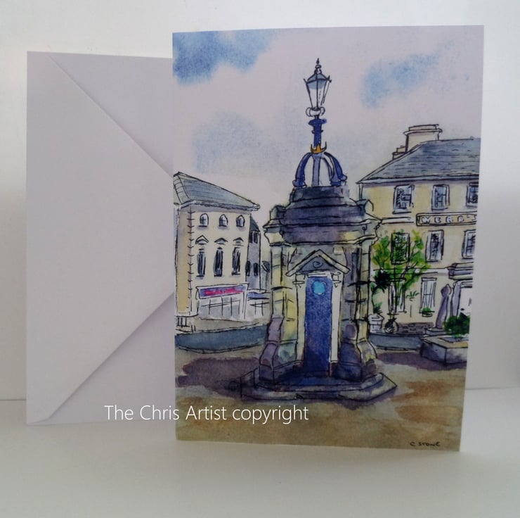A professionally produced greetings card printed from from my original watercolour pen and wash of Liskeard town centre, Cornwall. It features the historic drinking fountain in the foreground with Webb's House in the background. Both are listed buildings. My adoptive home town often gets overlooked, so happy to feature it in my artwork.
