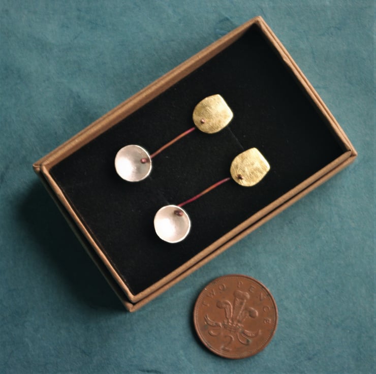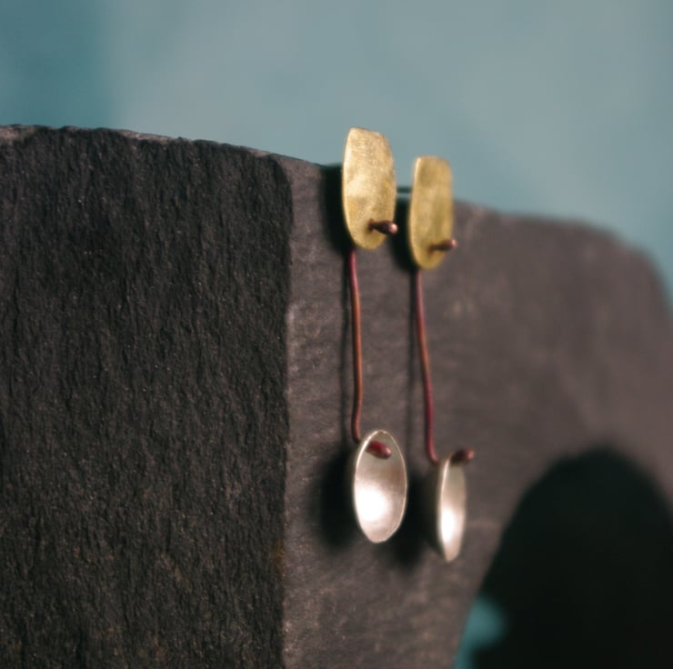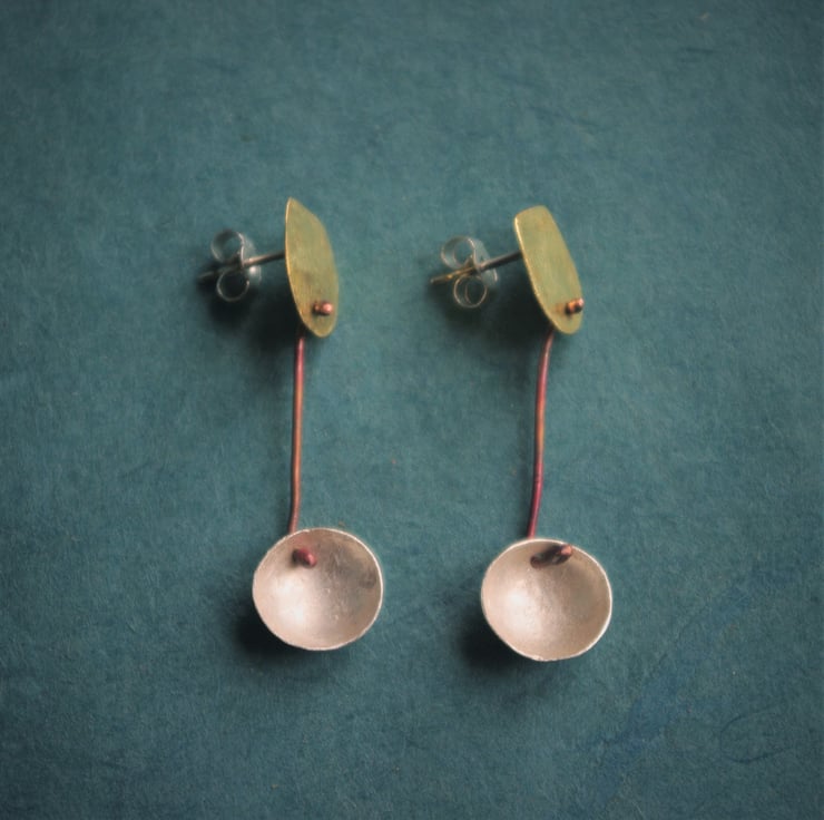 A domed circle of sterling silver hangs from a semi circle of brass with a piece of copper wire . The silver cup has a frosted , matt surface on the inside.The copper wire has tones of red within the copper as a result of heat treatment and the brass piece has a contrasting matt texture to its surface.