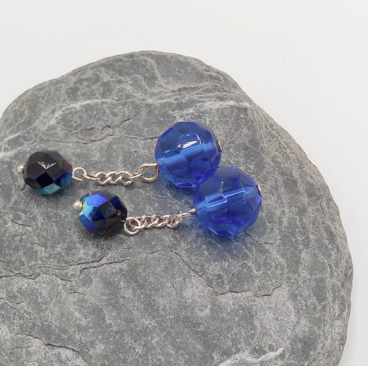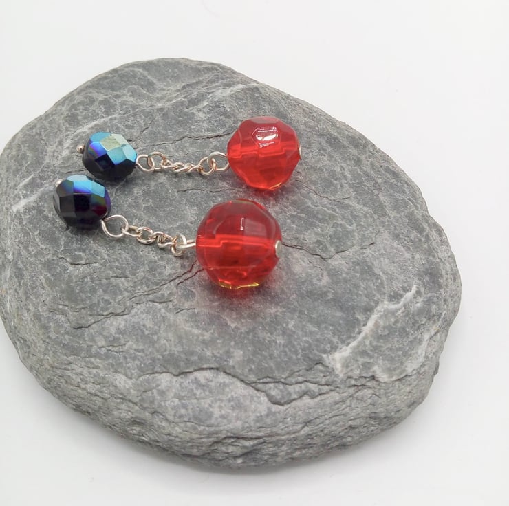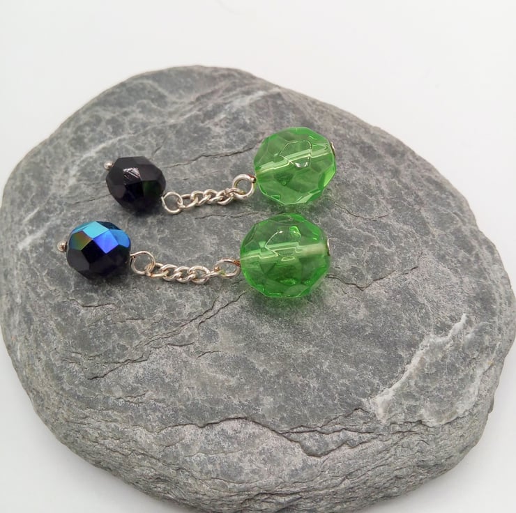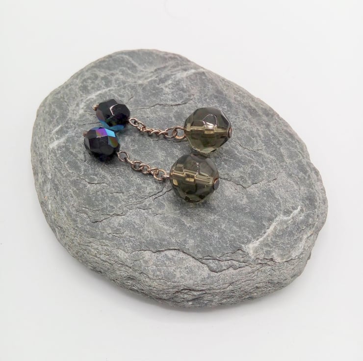 The cufflinks are made using 12 mm Round Crystal Beads with smaller, 8 mm black/purple irridescent faceted bead. Both beads are held on piece of silver plated chain 10 mm long to pass through the button holes. All metal components are silver plated.