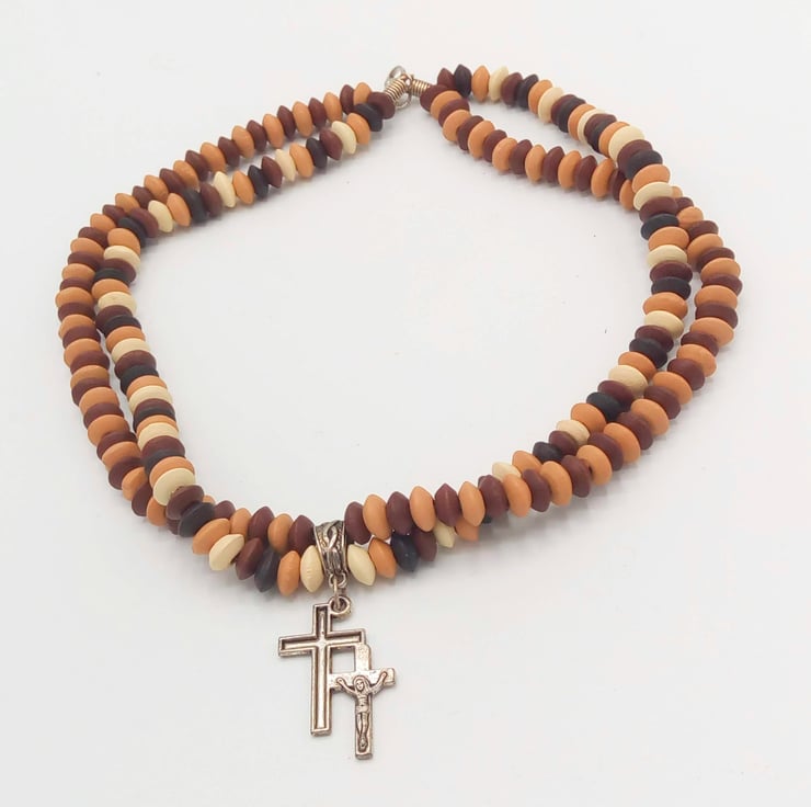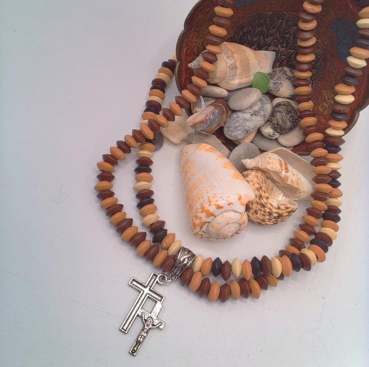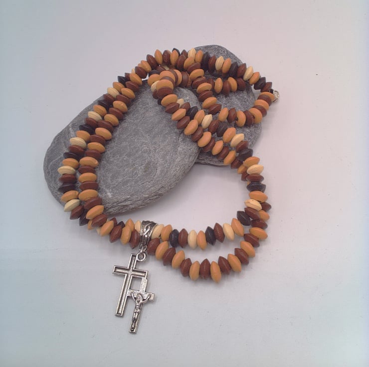 This Men's wooden necklace is made using wooden saucer beads in dark brown, light brown, black and white with a silver plated double cross in the centre. It would make an ideal birthday or Christmas gift for any of the men in your life, or as a gift for Fathers Day. The necklace is made using 6 mm wooden saucer beads and a 3 cm x 2 cm silver plated double cross charm in the centre. The clasp is a silver plated lobster clasp. It is 39 cm long. The necklace will be dispatched wrapped in tissue paper in an organza bag and delivered to you via Royal Mail first class post.