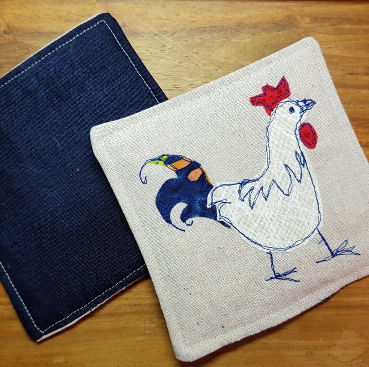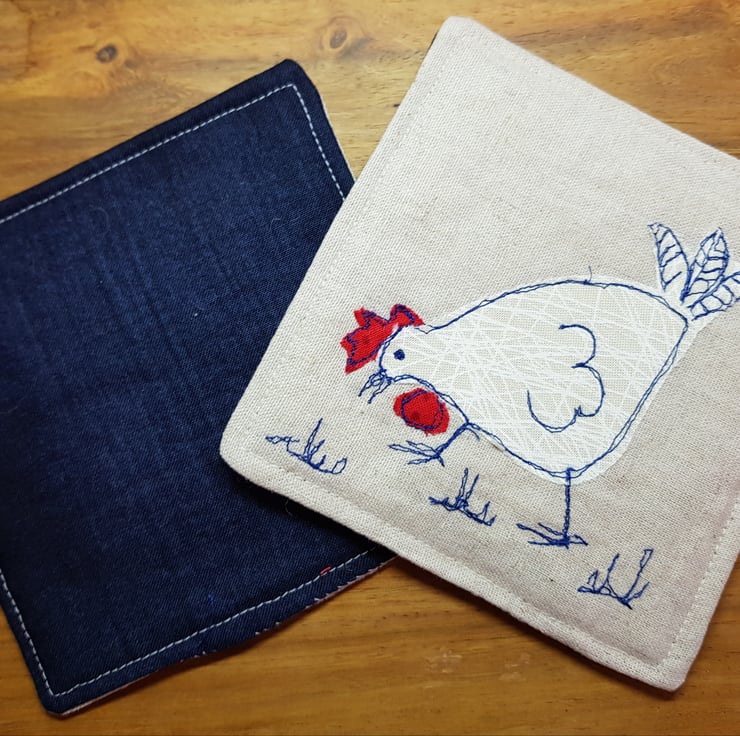 As you can tell from my shop name, I have a liking for chickens and they often feature in my drawings and have included a picture of the inspiration. This is not included with the coasters. I have made cushions using this method so decided to make coasters as well. With my husband's upholstery business we work to use up all odd shaped off cuts as part of reducing our impact on the environment and the lining for the coasters is felted wool which he uses in traditional upholstery.