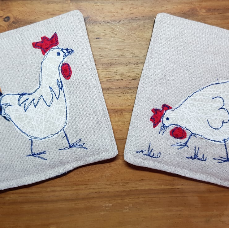 This pair of coasters is made using free motion machine applique based on my own ink drawing of a rooster and a hen. I call it drawing with my sewing machine.