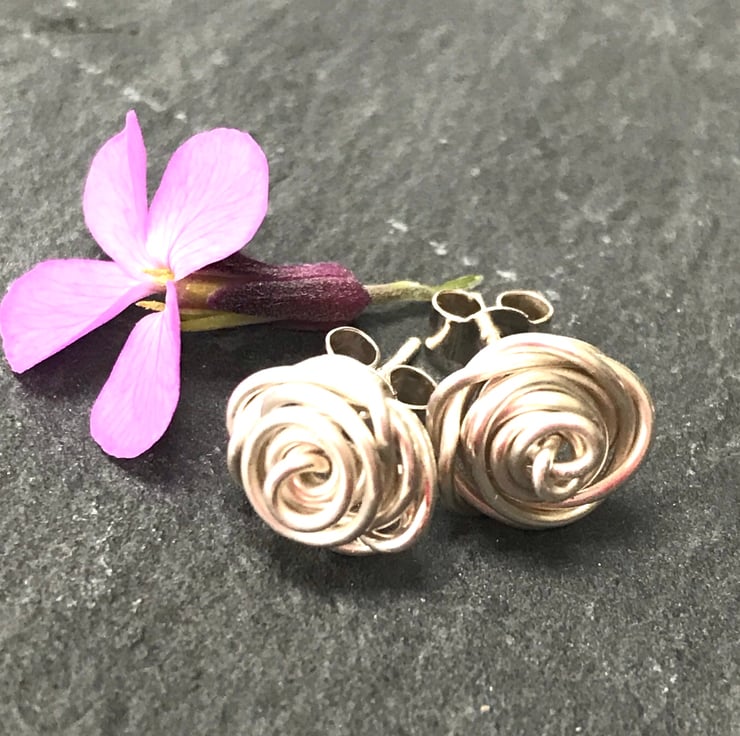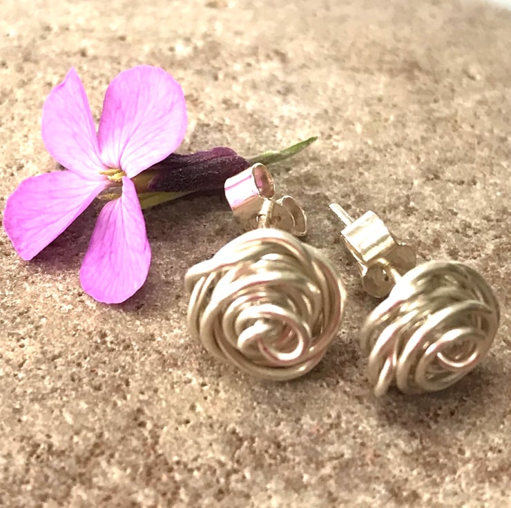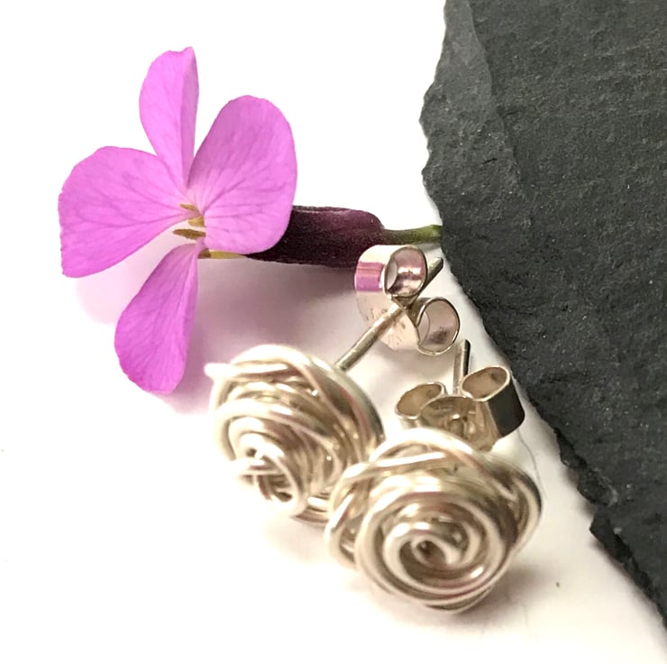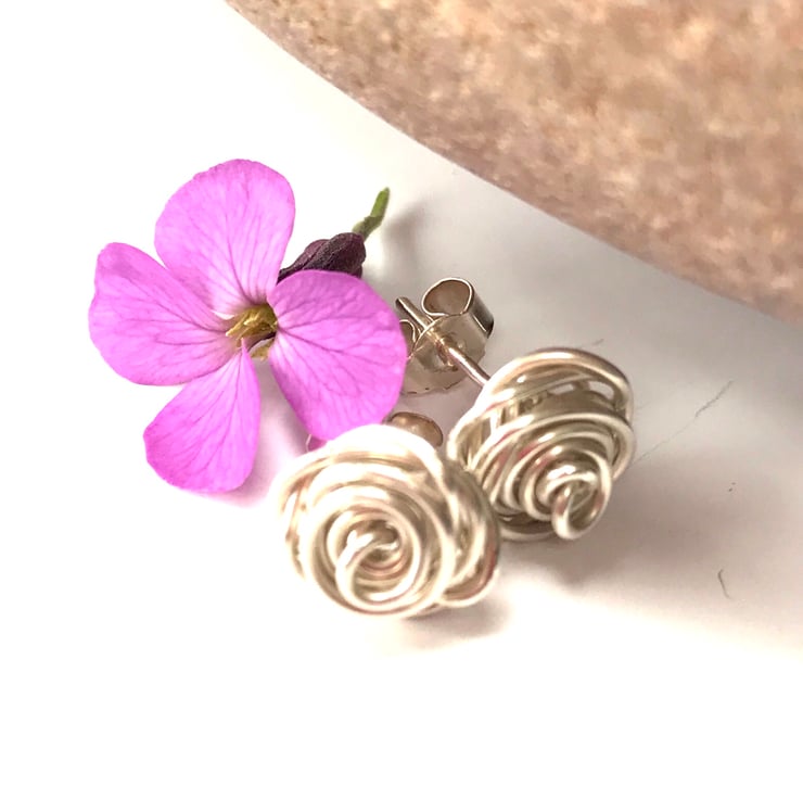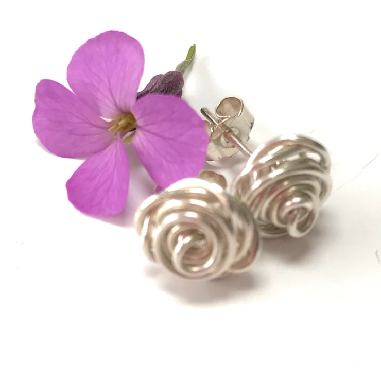 These pretty earrings are made from sterling silver, created using a wire wrapping technique. They are finished with sterling silver 'butterfly' stud fittings.