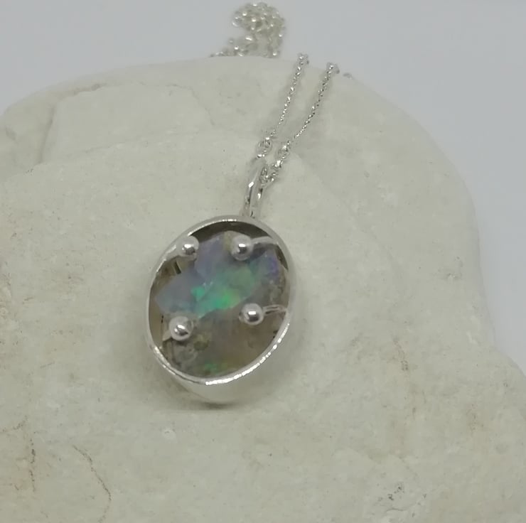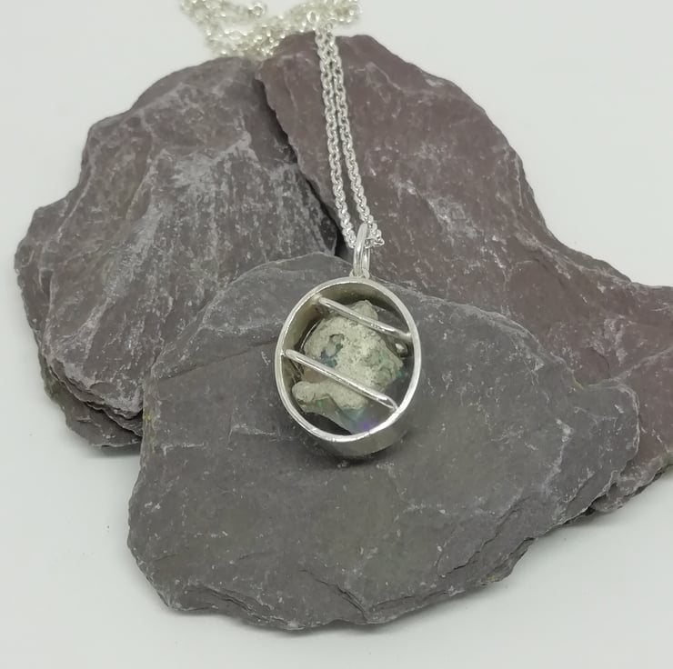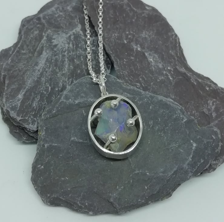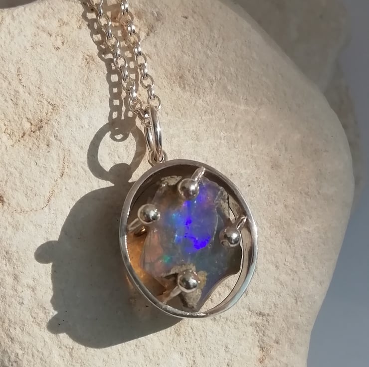 A raw opal stone is caged in a silver oval and secured with ball topped clasps. The opal is a translucent blue colour and flashes of turquoise and violet sparkle through it. The silver oval is 17mm long, 15mm wide and 7 mm deep. It is hung on an adaptable 45 cm belcher chain.