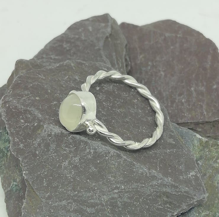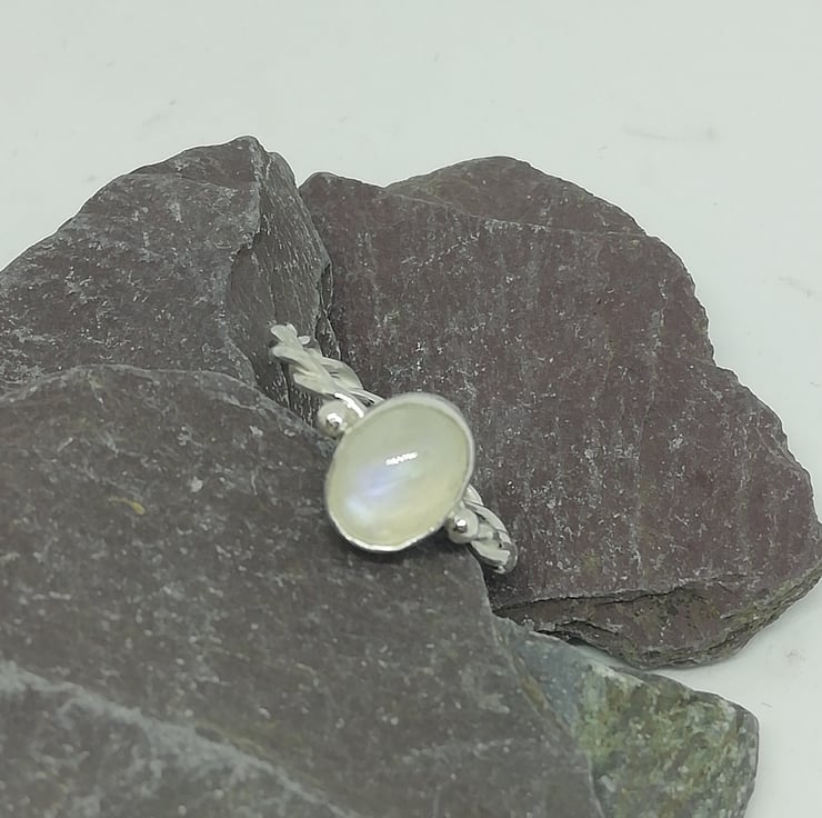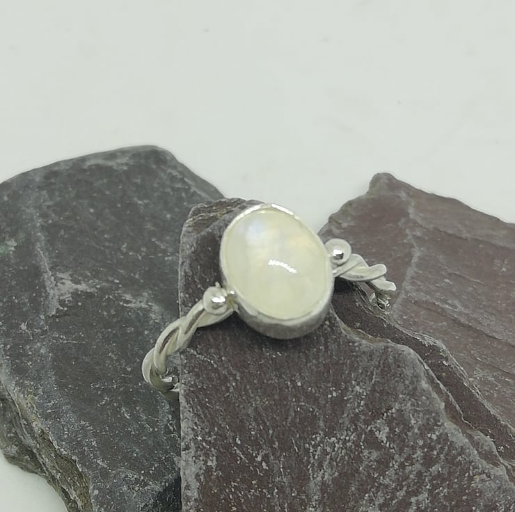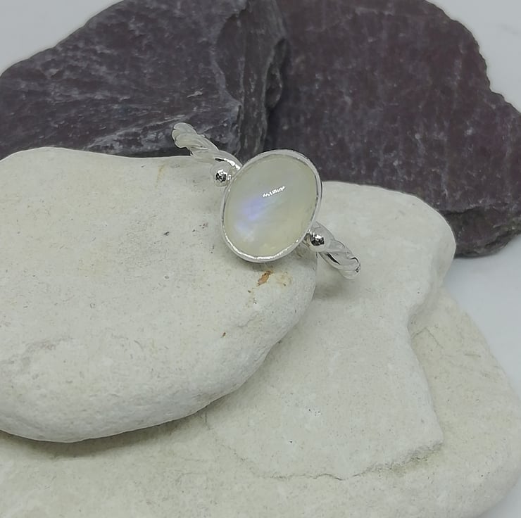 An oval moonstone cabochon 10 mm x 7 mm is set on a ring of twisted silver. When the light catches the moonstone flashes of blue appear. A solid silver ball added either side of the stone adds detail. The silver twist is 2 mm diameter and the ring is available in size S. I can make this ring to order.