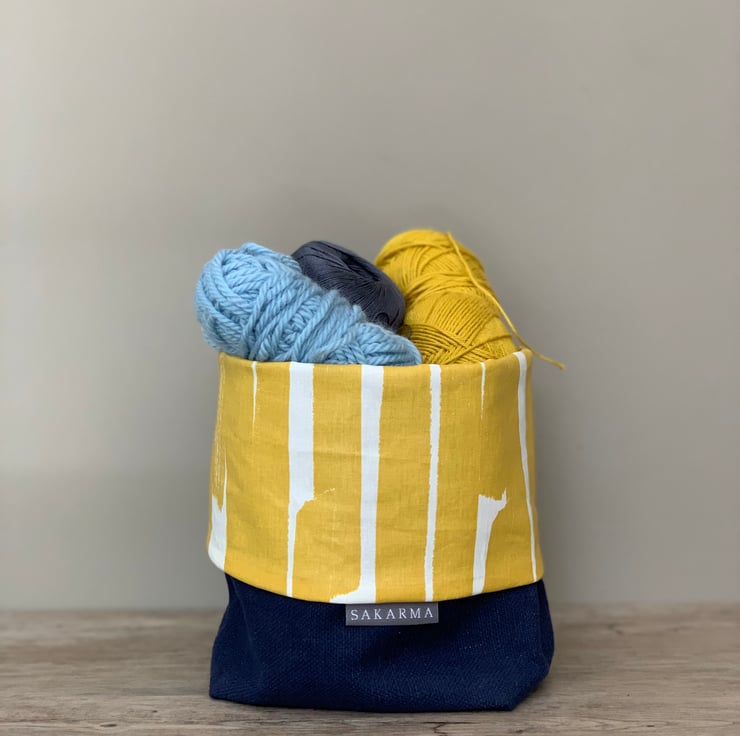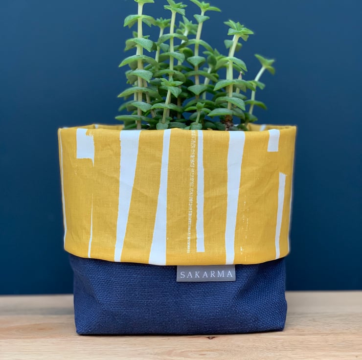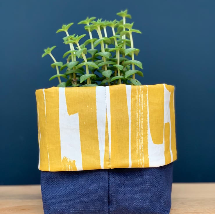 Fabric storage bag, suitable for anything from plants to wool and everything in between. Fold over mustard and white lining, which is acrylic coated cotton, so wipe clean. If using for a plant, I recommend removing the plant before watering.