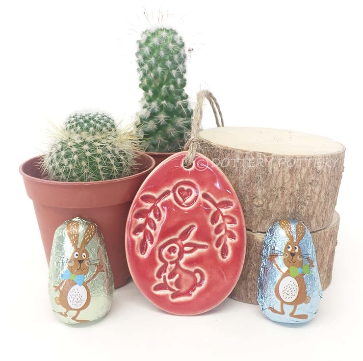 This cute little pottery Easter Egg decoration is hand cut from white earthenware clay, fired once, a rich glossy green glaze is applied and it is then fired again - so is nice and strong. This is the price for ONE egg. It measures 6.5cm x 4.5cm and hangs from a cream organza ribbon It is glazed on the front and left plain on the back.