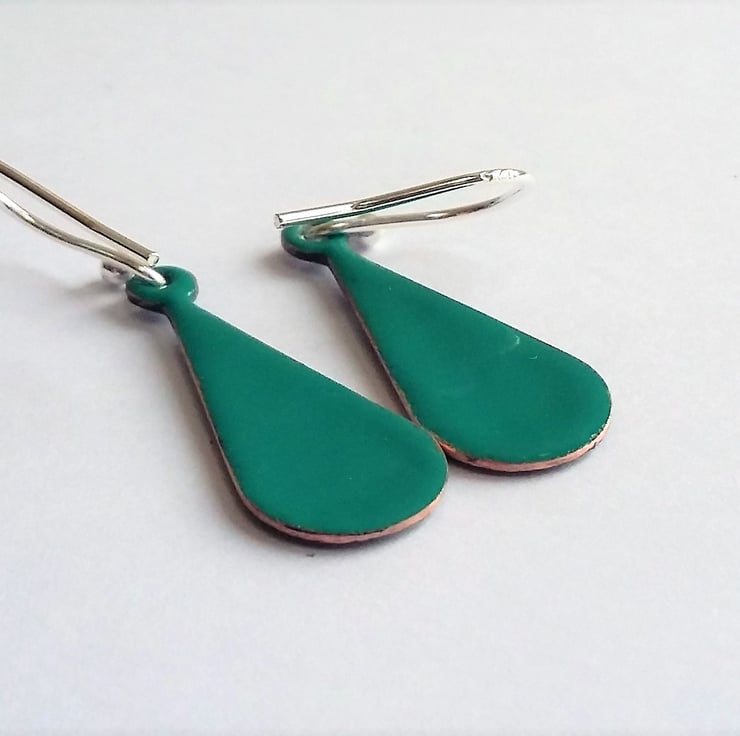 A pair of teardrop shaped earrings in shades of blue. The earrings have been kiln-fired and each measures approximately 27mm long and 6mm wide at the widest part. They come complete with sterling silver earring wires, and the backs have been finished in glossy turquoise enamel. They are supplied with a little organza pouch and POSTAGE IS FREE!