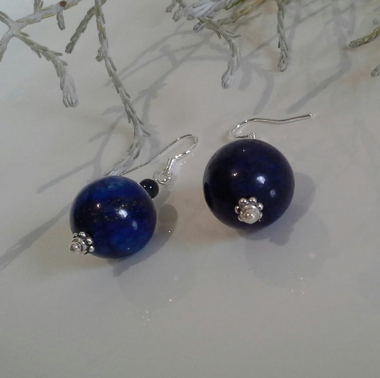 A very eye catching pair of earrings hand crafted using large 18 mm rounds complimented with smaller 3 mm round genuine lapis lazuli gemstones. They have been crafted from all 925 sterling silver components.