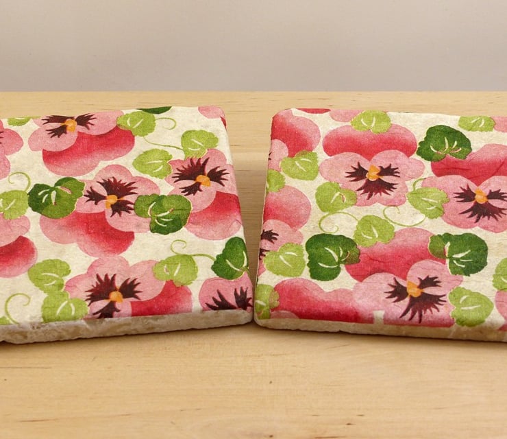 A pair of marble coasters measuring 10cm x 10cm decoupaged with a pretty paper napkin of pink pansies. The coasters have been coated with lacquer so they can be wiped with a damp cloth (do not immerse in water) and have four plastic feet on the base to protect your furniture. An ideal gift for family or friends.This item will be sent by Royal Mail packed to arrive safely.