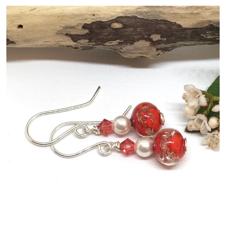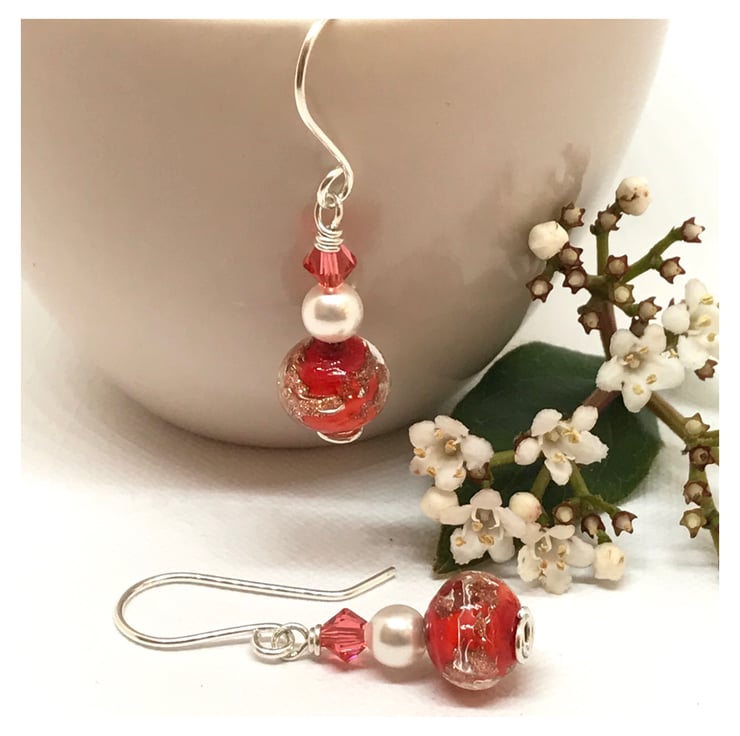 These earings are handcrafted using sterling silver wire. I have created a swirl base and added beautiful Murano glass beads which are orange with gold foil swirls giving them a lovely shimmer. I have added white pearls and padparadascha crystals which are an orange pink colour all from Swarovski® Crystals. The ear wires are handcrafted by me in sterling silver.