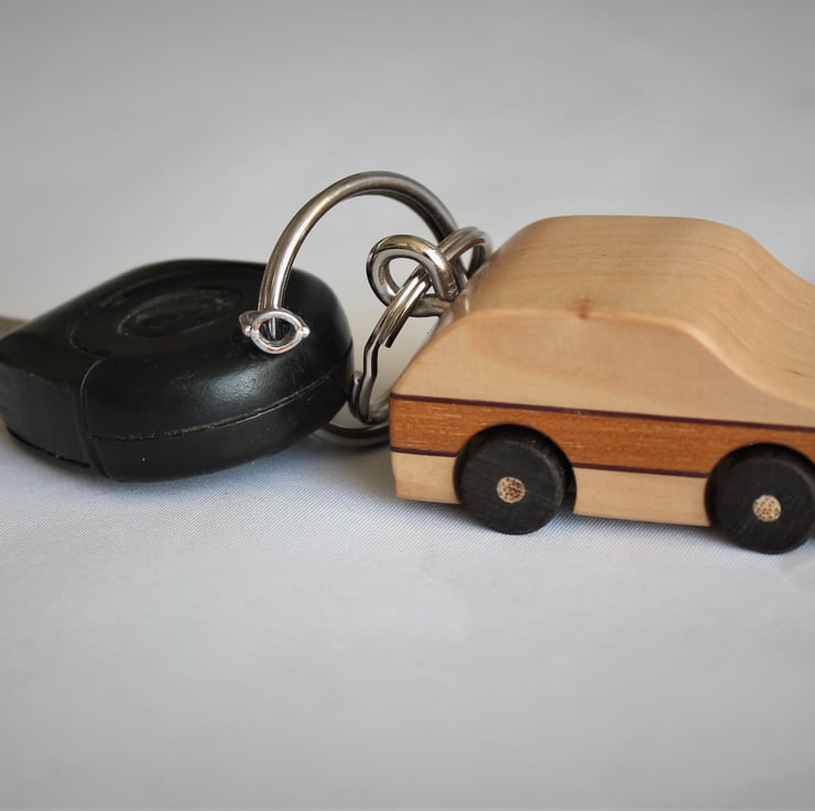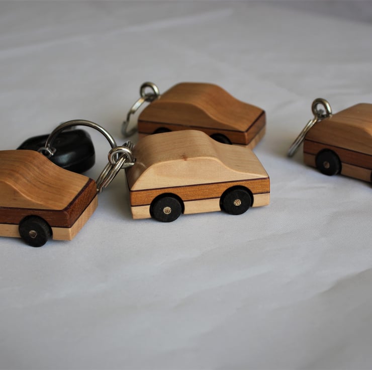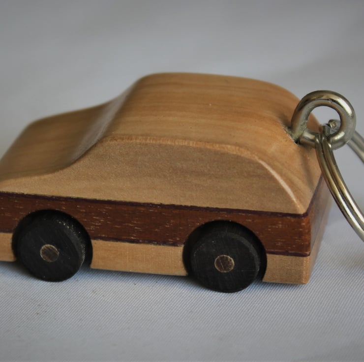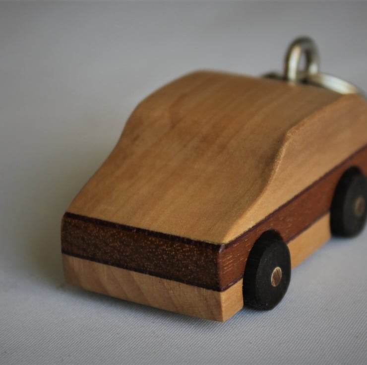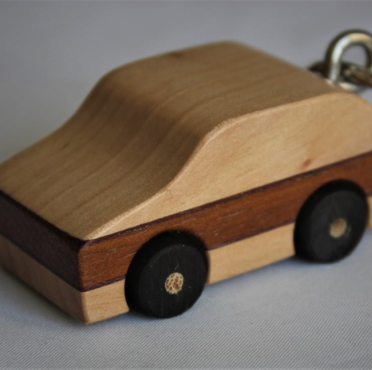 Made from apple wood with a padauk centre strip. The purple thin lines are purple wood veneer. The wheels are made from ebony on a bamboo axle which turn smoothly. Very robust and tactile. Great for your car keys. Car mechanics cant help but play with it.
