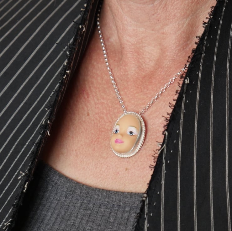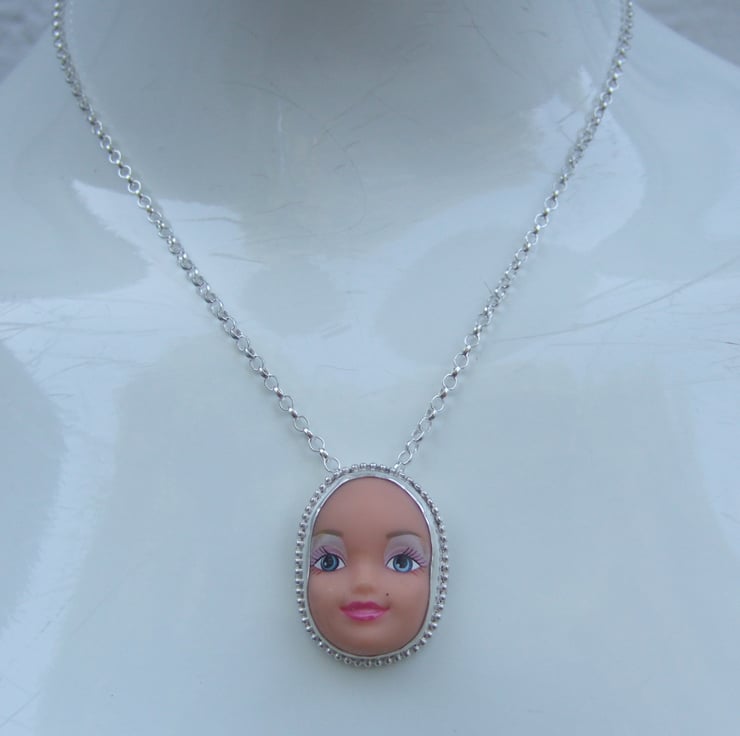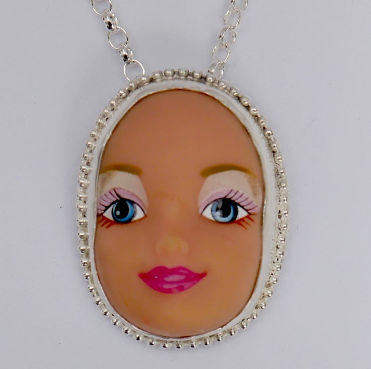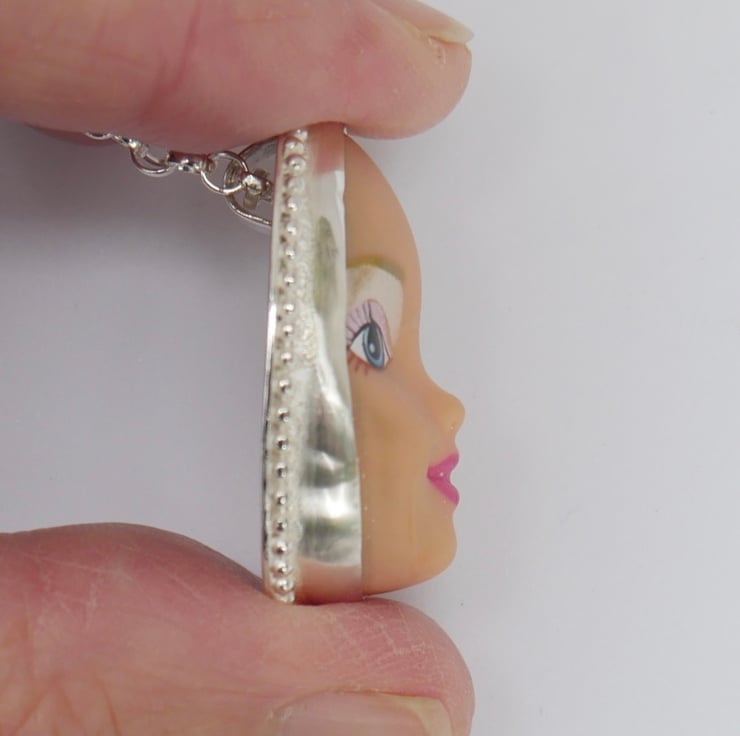 This unique, One of a Kind Doll Face Pendant measures just over 3 cm in length and 2.5 cm at its widest point.