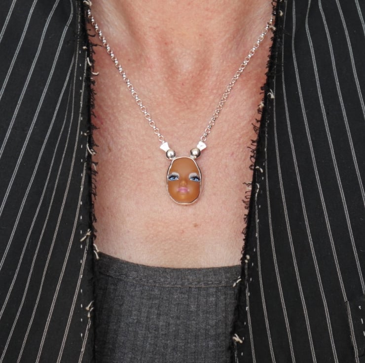 This unique, One of a Kind Doll Face Pendant measures approx 2 cm wide and just over 3 cm in length including the space buns.