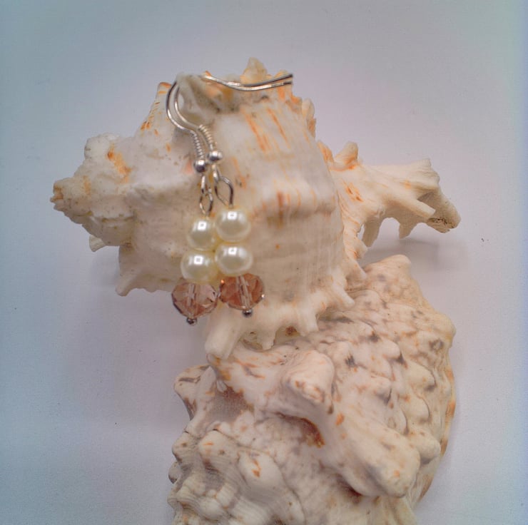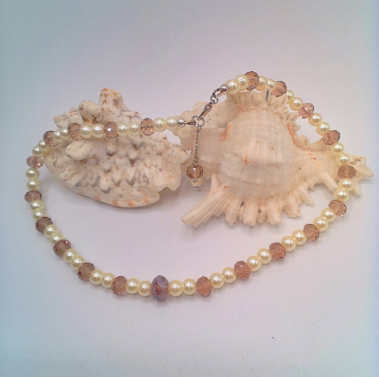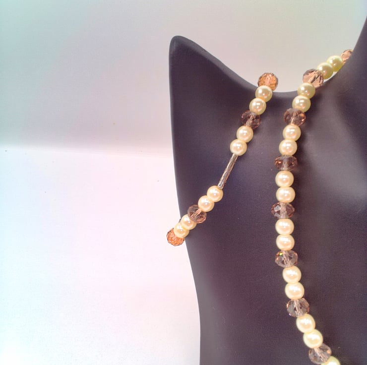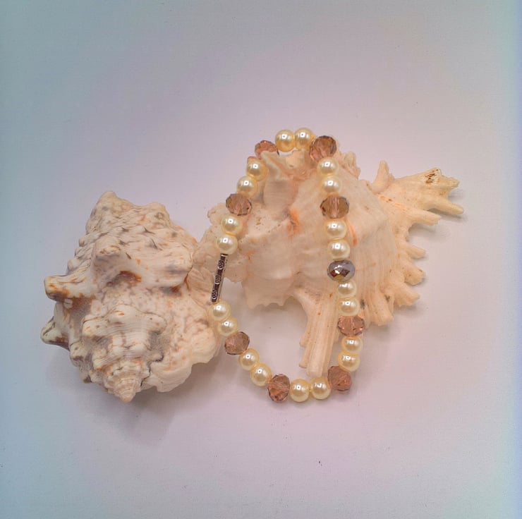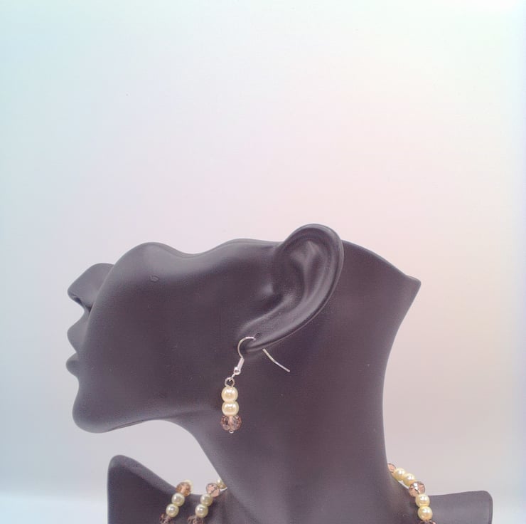 This sweet pearl and crystal jewellery set comprises a necklace, bracelet and pair of earrings. It would look great for any special occasion or party. The necklace is made using 6 mm cream glass pearls and 8 mm crystal abacus rondelle mauve crystal beads. The necklace has an extender chain incorporating a pearl and a crystal fob. There is a silver plated lobster clasp to secure the necklace. The bracelet is elasticated so that it will fit most sizes of wrist. The earrings have sparkly crystal silver plated ear wires. The necklace is 15.5 inches (39 cm) in length and it is fastened with a silver plated toggle clasp. The bracelet is 7.5 inches (18 cm) in length in its unstretched state and the earrings have a drop of 1 inch (2.5 cm) and they are suspended on silver plated crystal ear wire. The set will be dispatched wrapped in tissue paper in an organza bag and be delivered via Royal Mail first class post. The set would be an ideal gift choice for a lady who loves pearls and sparkle.