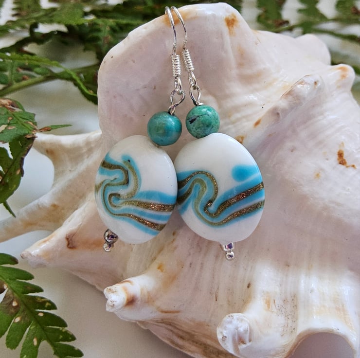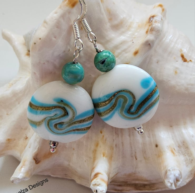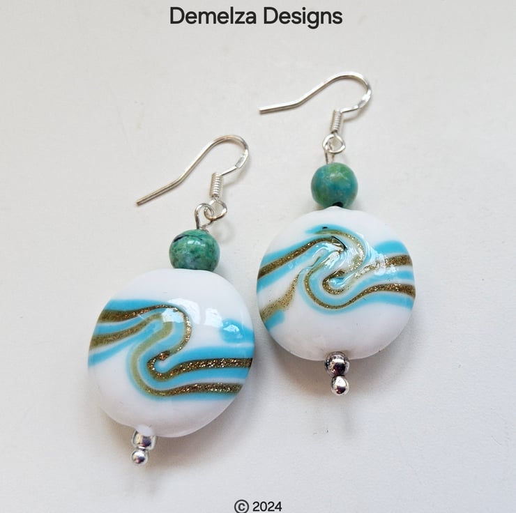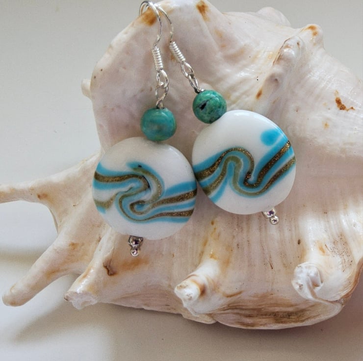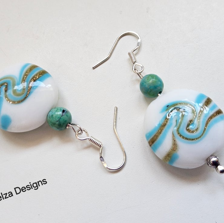 A unique pair of earrings designed and hand crafted using quality stabilized 3.5mm round genuine turquoise rounds with 20mm puffy coin hand blown genuine marano glass beads. The earrings have been constructed using all 925 sterling silver components.