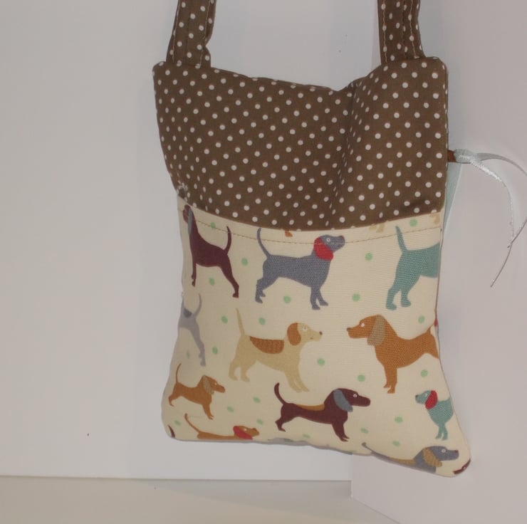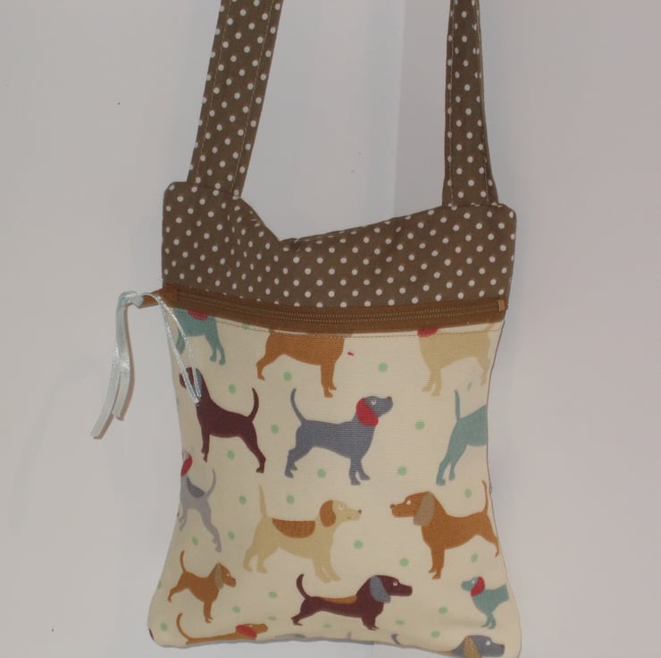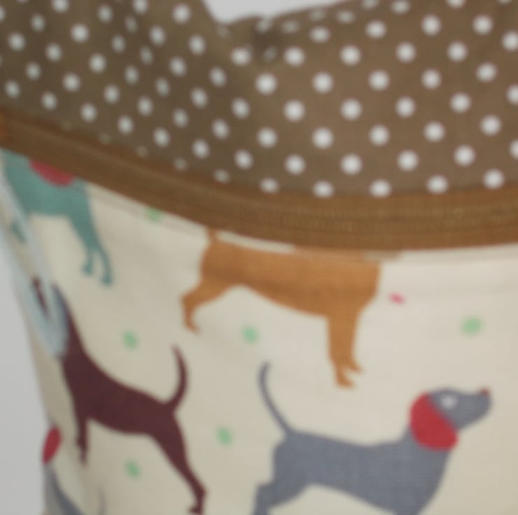 The fabric has dogs in various printed on it. the background is cream. The lining is brown with white spots.