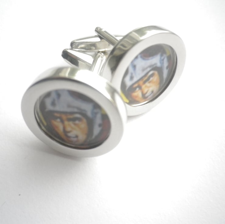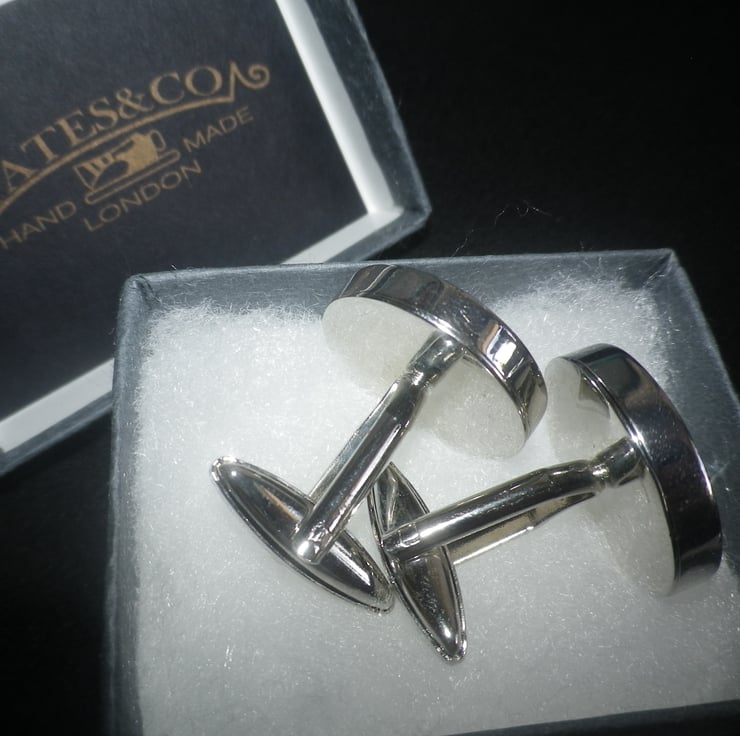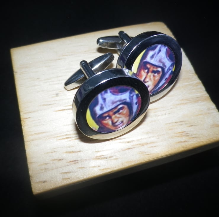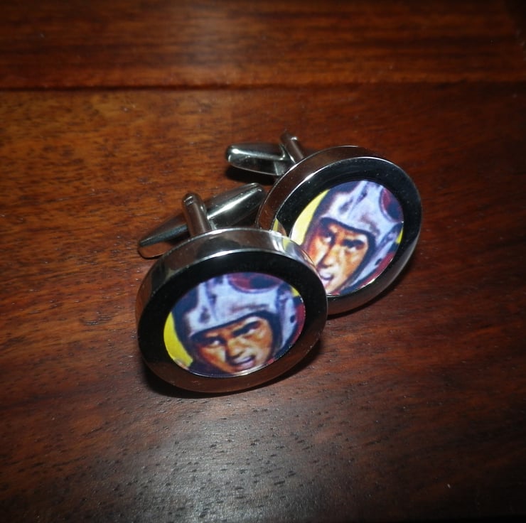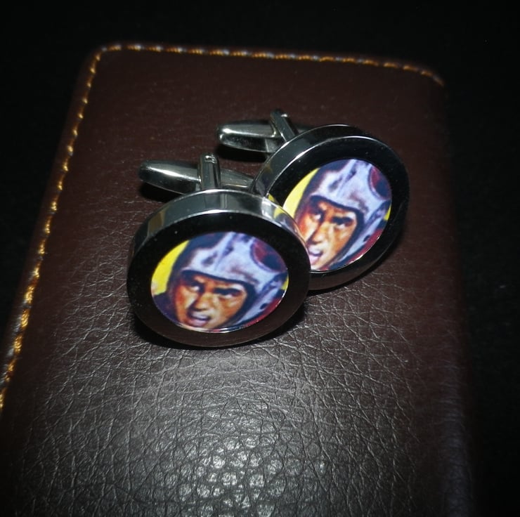 Part of an edited collection of exceptional vintage and contemporary sport images we have made available on high quality cufflinks......they have an even, smooth, highly polished silver finish, with a deep setting and a swivel action 'cigar' shaped shank for ease of use. Crafted from rhodium plated alloy the image has a 15mm ( 3/5" ) protective transparent film, with a neat presentation box..