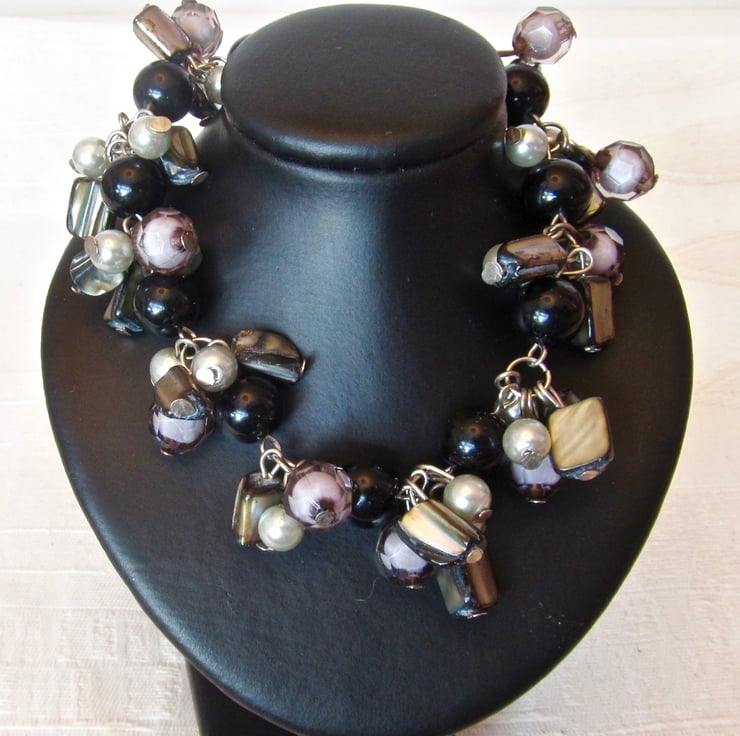 Separate clusters of tiny ice blue pearls, small smoky coloured mother of pearl nuggets & smoky, facetted clear beads with white centres are attached to their own O ring, making small, separate clusters of beads. Between these clusters are larger black glass pearls, partitioning the separate clusters of beads. The smoky mother of pearl nuggets show flashes of orange, dark blue and purple as they twist in the light.