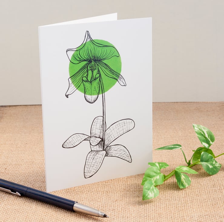 A beautiful greetings card with a minimalist illustration of a lady slipper orchid on it. The design and illustration was done by me and was inspired by Huevember 2018 when I matched up the day's colour with a flower. Original image was created with ink pen and either Copic or Promarkers.