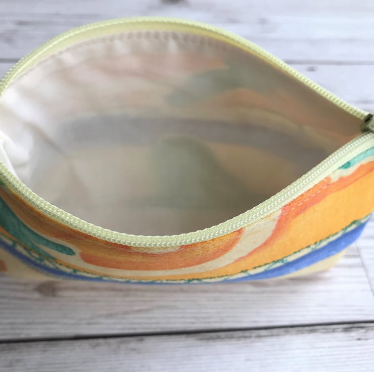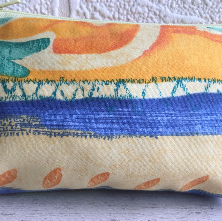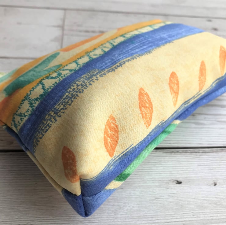 A lovely large coin purse in an attractive abstract print pattern with a tropical theme. The pattern features an abstract design in beautiful tropical colours, including bright blue, orange, green and pale yellow. The coin purse has a matching pale yellow zip and is lined with cream fabric. The base of the purse is boxed to give a spacious interior.