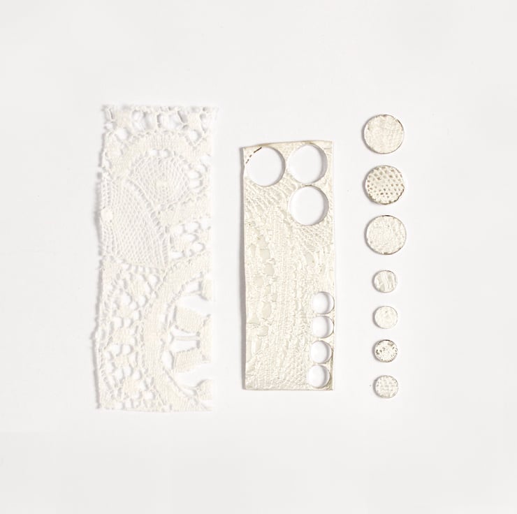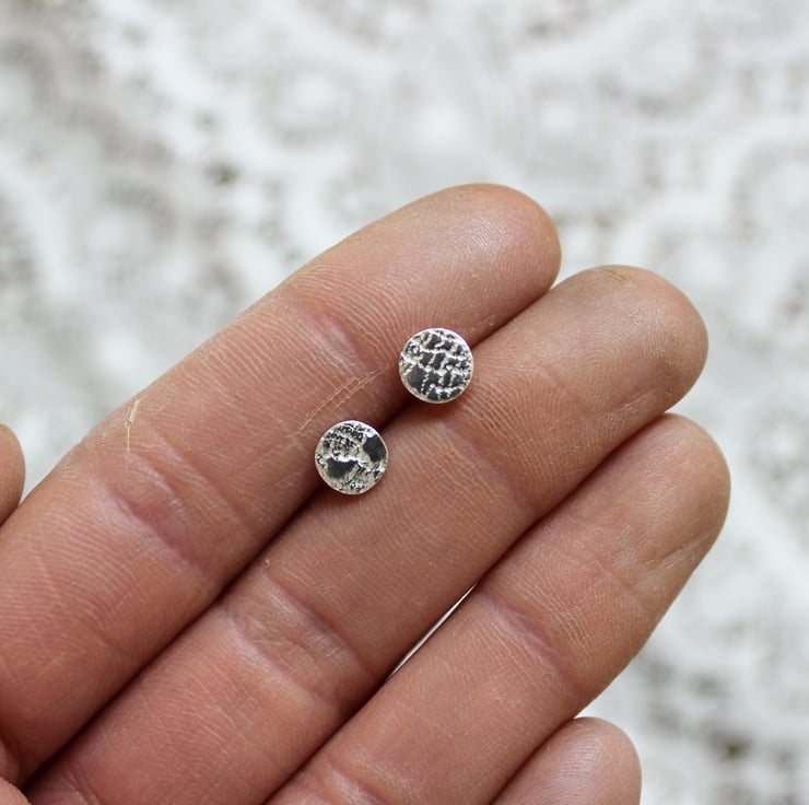 Using my rolling mill to impress onto silver sheet I then use a disc cutter to punch circles out before filing, lots of emery and then polishing once I have securely soldered sterling silver ear posts to the back.