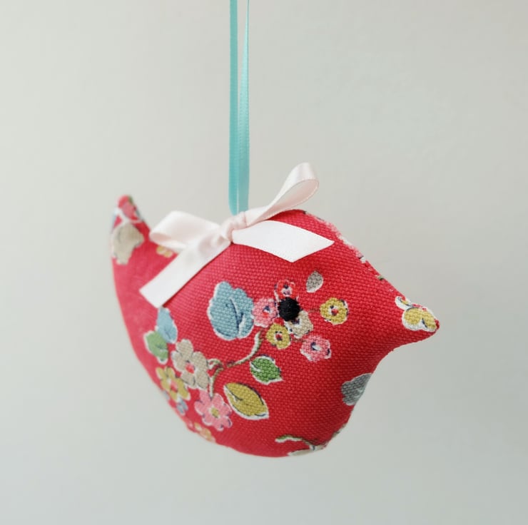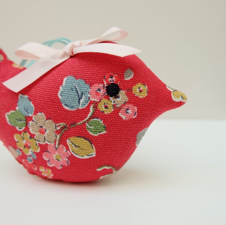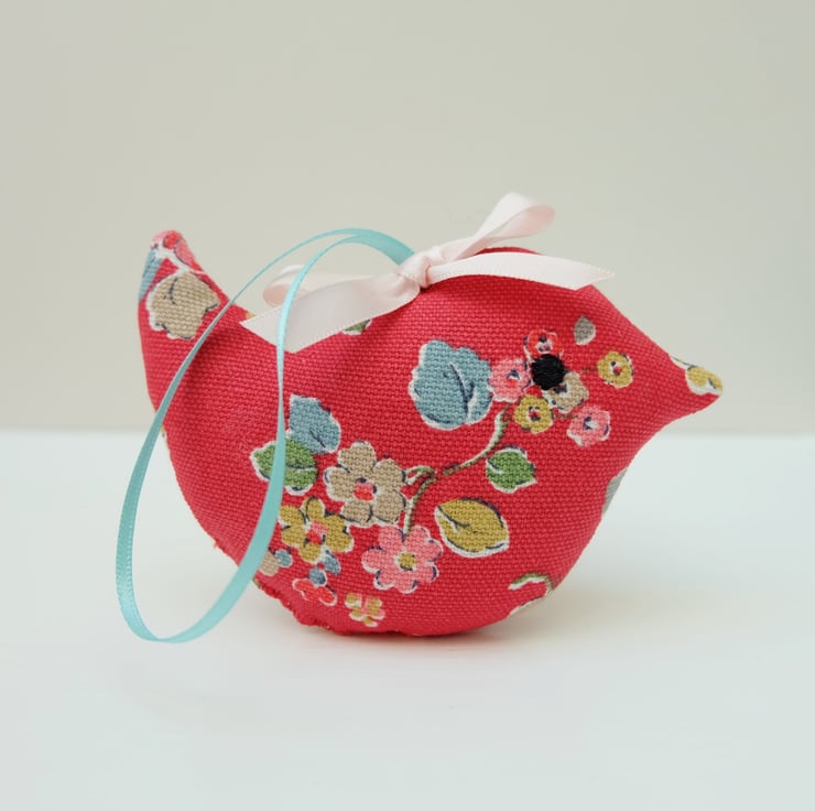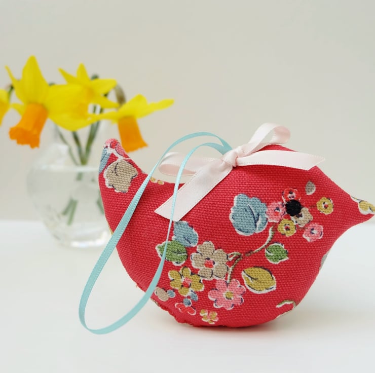 Usual price £4.25, this is a SPECIAL PRICE mini lavender bird, in a pretty, red floral cotton duck fabric by Cath Kidston. Scented with lovely lavender and designed to hang in your wardrobe to scent and freshen clothes, or it can be hung on a bed post or door hook as a pretty decoration. These little birds make lovely gifts for Easter, birthdays and Mother's Day.