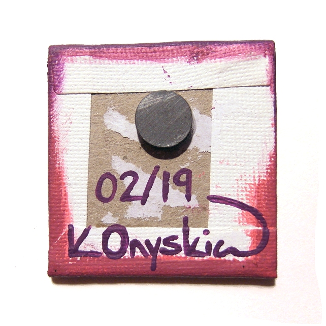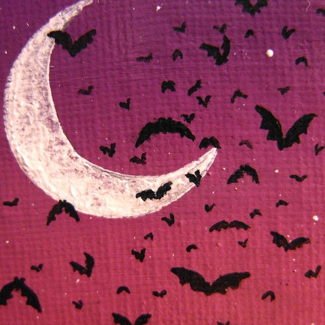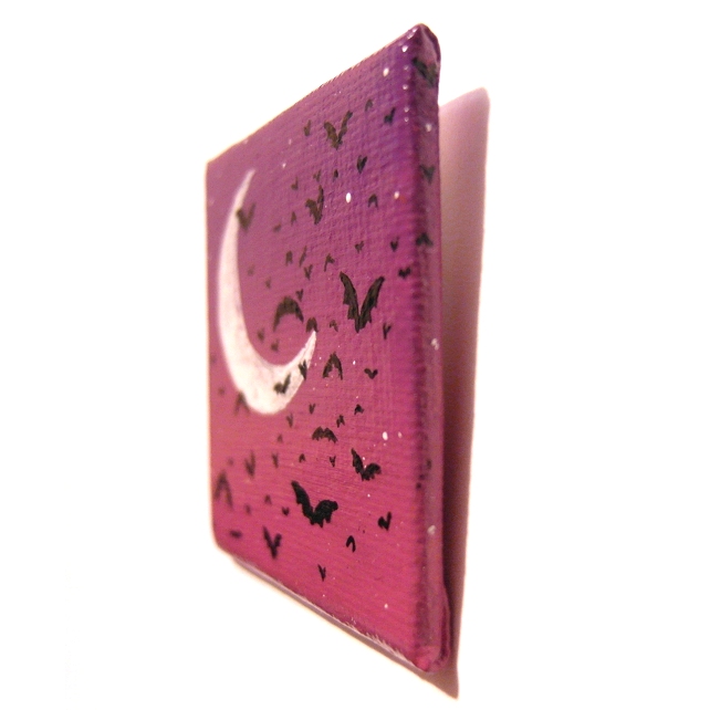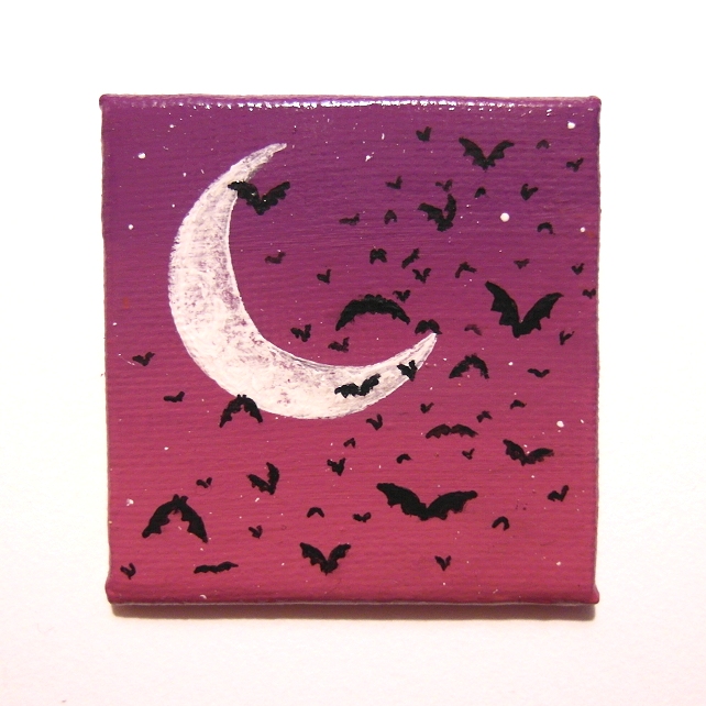 This small original bat artwork is painted in acrylics on a 5cm x 5cm (2" x 2") canvas board, and has been coated with a layer of clear varnish to make it more durable. A 12mm magnet is attached to the back so this little painting can stick on a fridge or other magnetic surface.