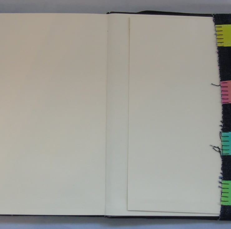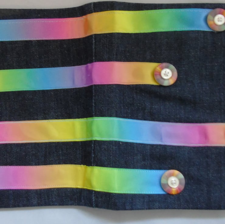 Hardwearing denim cover made from denim fabric and decorated with rainbow ribbon and button detail on the front cover