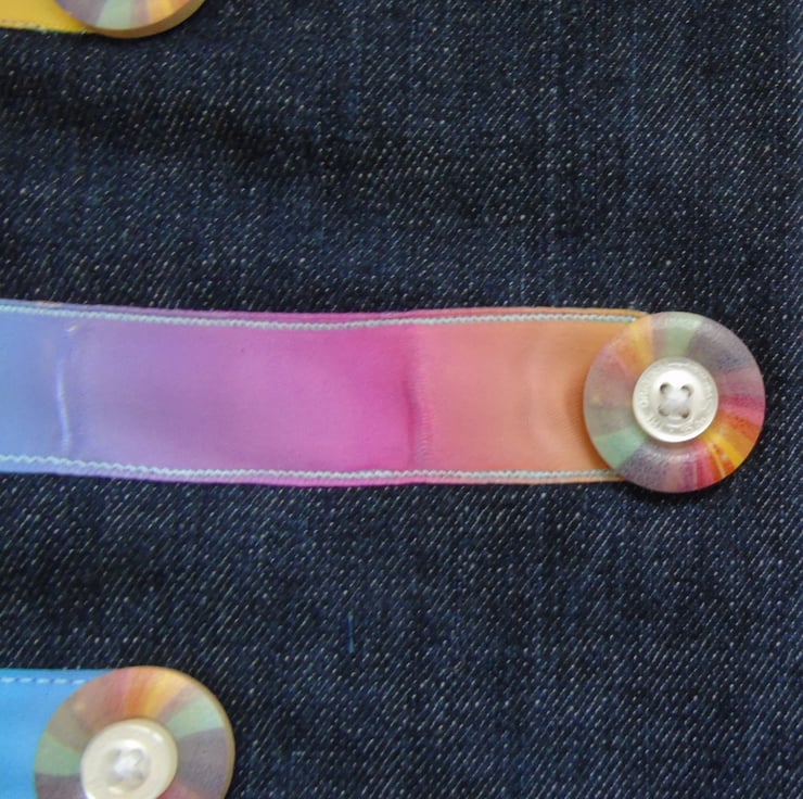 We love denim and rescuing those jeans that have seen better days. This was actually inspired by the album Dark Side of the Moon and those rainbow rays shooting off the triangle. The rainbow buttons with rescued shirt button help to add texture and detail.