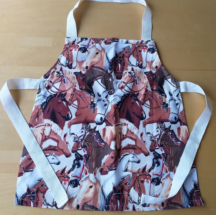 This is a pinny for horse lovers! Horses and ponies appear all over a beige background. (They may not appear in the same place as in the photo.) I have made it of a heavy quality machine washable cotton, with acrylic webbing straps. It measures approximately 17" (43 cm.) from neck to hem, and 14" (36 cm.) at the widest point, and will fit a child from about 2-6 years. The child in the photo wearing a different apron is three years old.