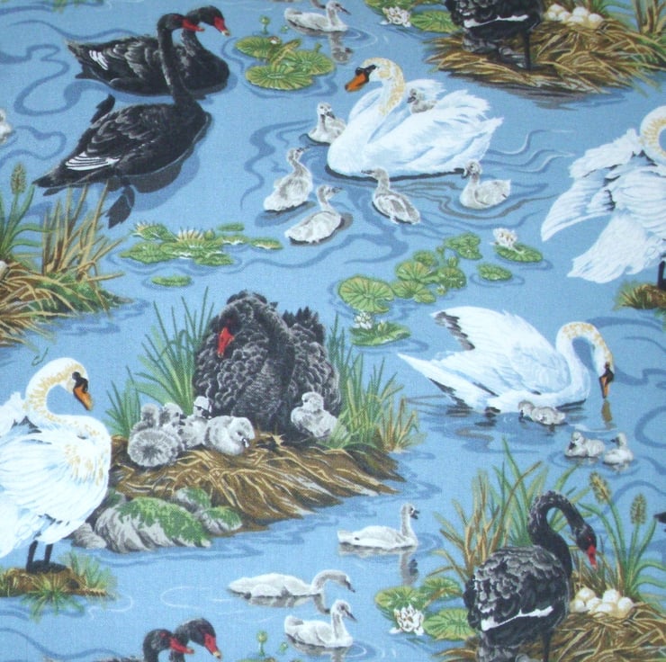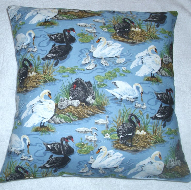 A square cushion with black swans nesting on grassy islets, with their cygnets and white swans and cygnets on a lake with water plants and water lilies in between.