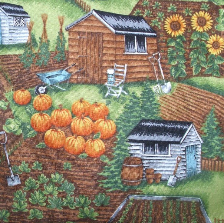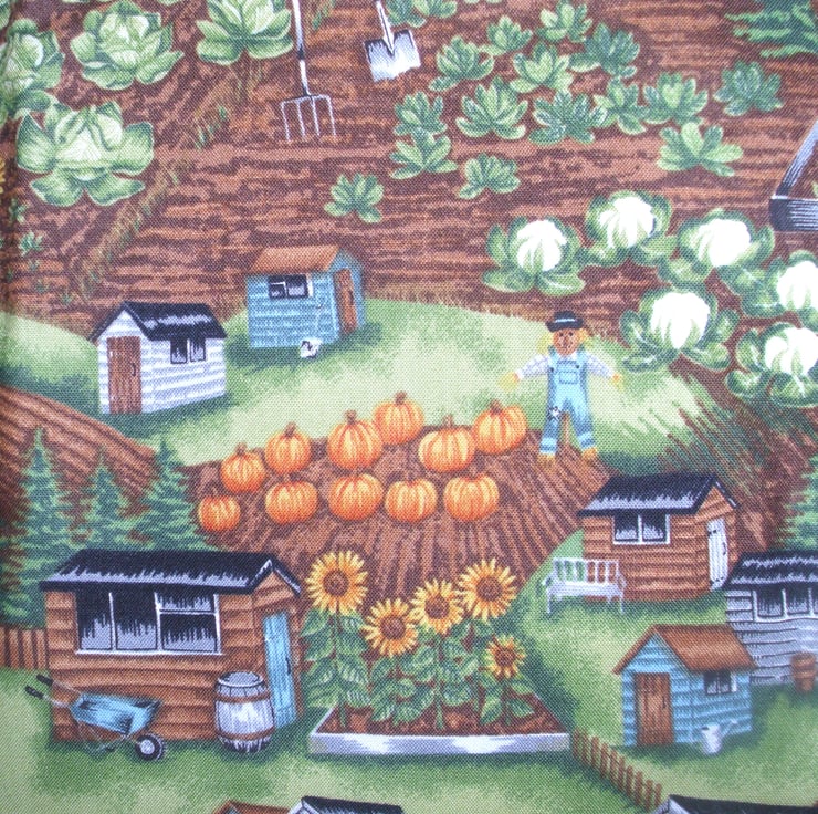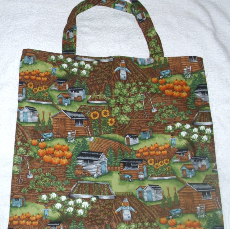 On the Allotments cloth shopping bag with sheds, plots full of vegetables, pumpkins, cabbages, cauliflowers, with tall sunflowers, garden tools, wheelbarrows and scarecrows , very comfortable to carry with fabric handles , ideal for carrying shopping . also useful as an overnight bag for all those essential items or as hand luggage when travelling , will hold for example : a wash bag , make up bag , a book . it measures approx 41.5 cm x 38cm .