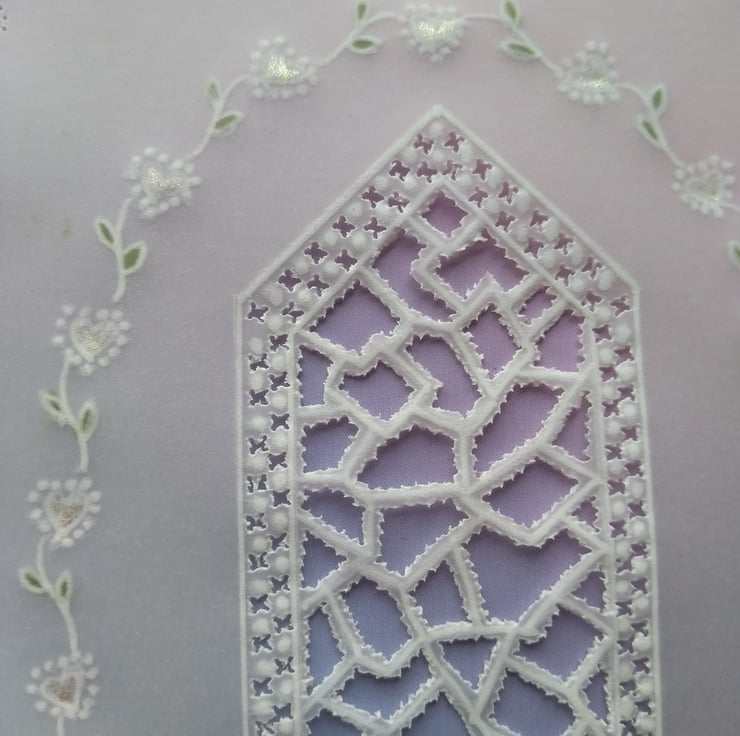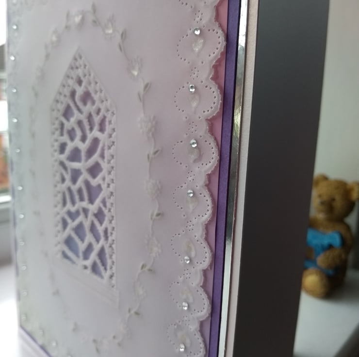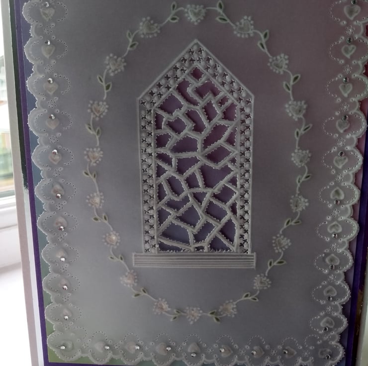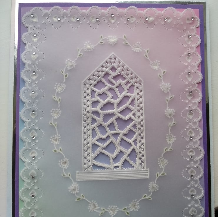 A completely handmade and uniquely designed card. Consisting of parchment which has been embossed, cut and pierced into a very pretty design. An oval of hearts and leaves in the centre to Ms Ch the scalloped border all around the card. The centre had been filled with z beautiful stained glass window. Finished off with silver rhinestones. Mounted onto lilac,,/,pink rainbow paper, then onto silver mirri card and then onto pristine white quality card.