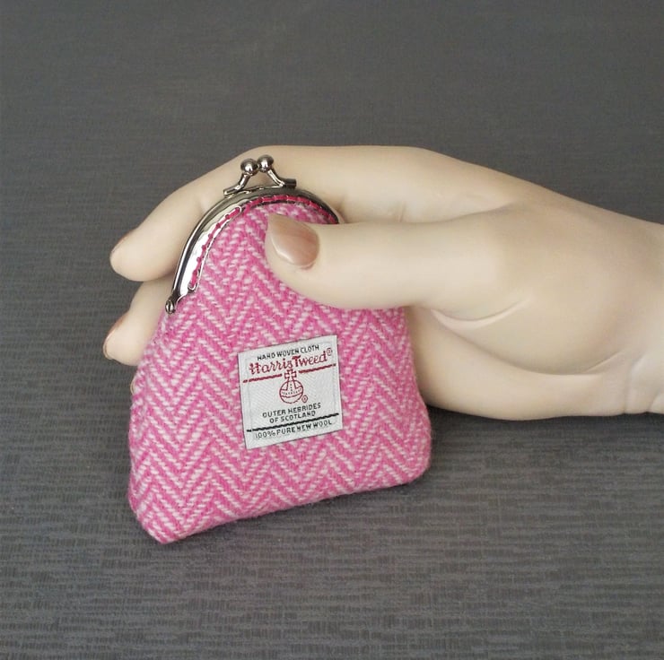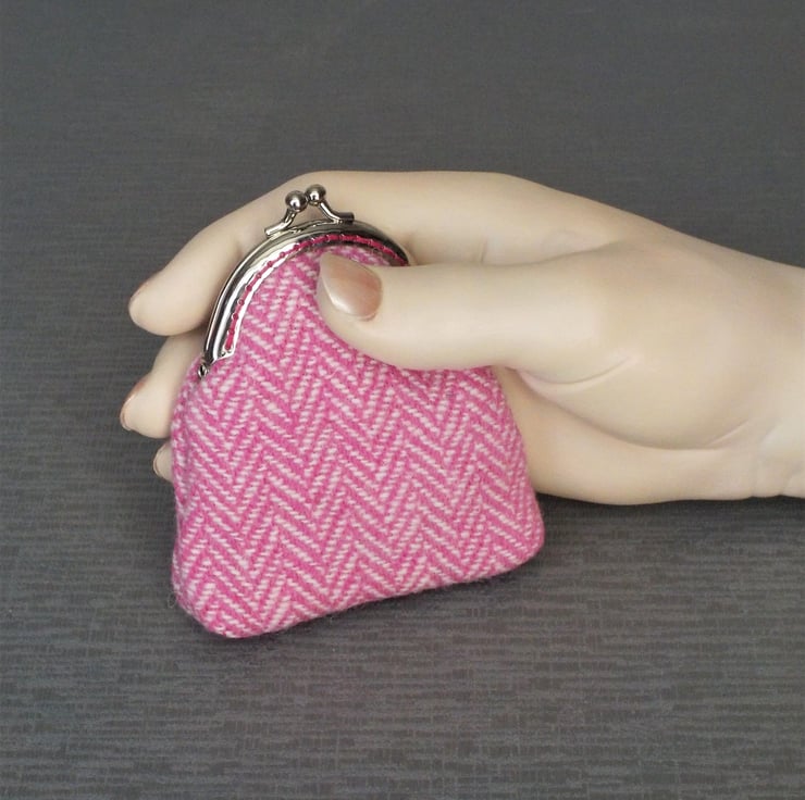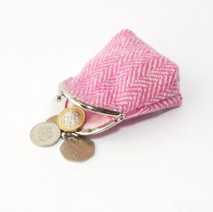 I have made this cute coin purse from a lovely pink and cream herringbone design of the world renowned Harris tweed fabric for the outside, and a toning cotton fabric for the lining. It closes with a kiss clasp top to keep your change safe.