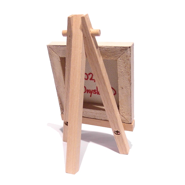 The mini egg canvas will either come with a 12cm (4.7") wooden easel for display, or will be strung with a ribbon in a colour that matches the painting so it can be hung on a wall (as in picture 5). Just choose with easel or ribbon hanging when you buy.