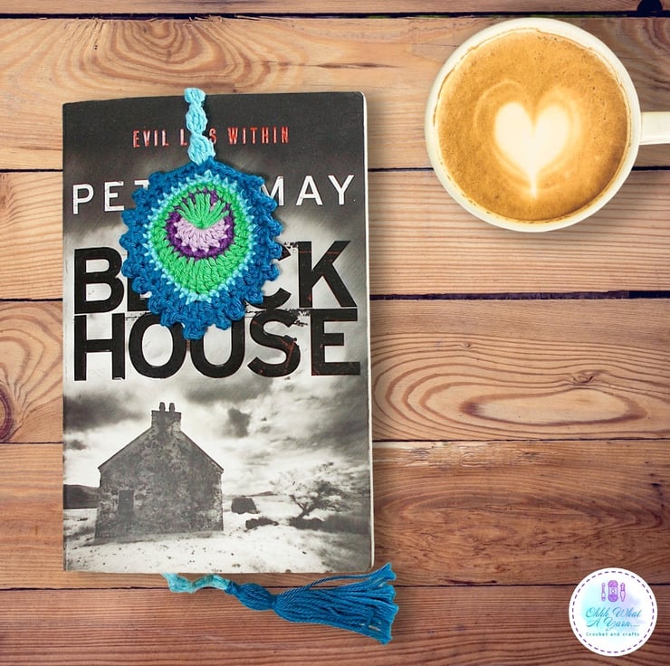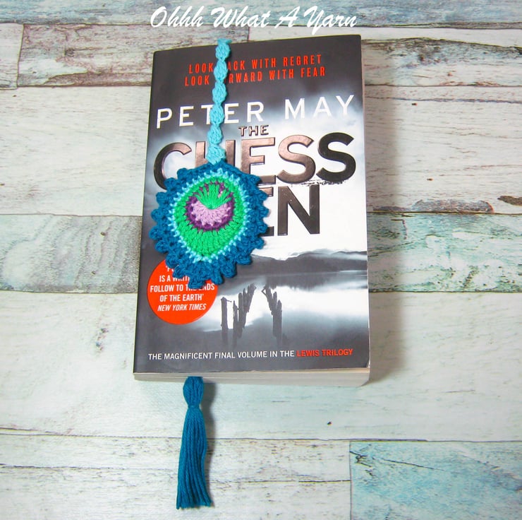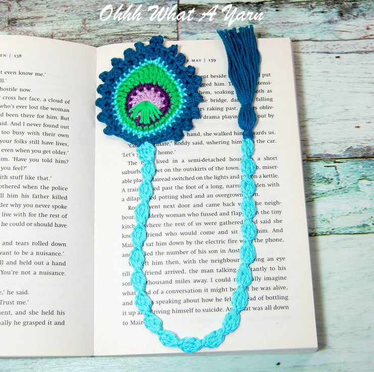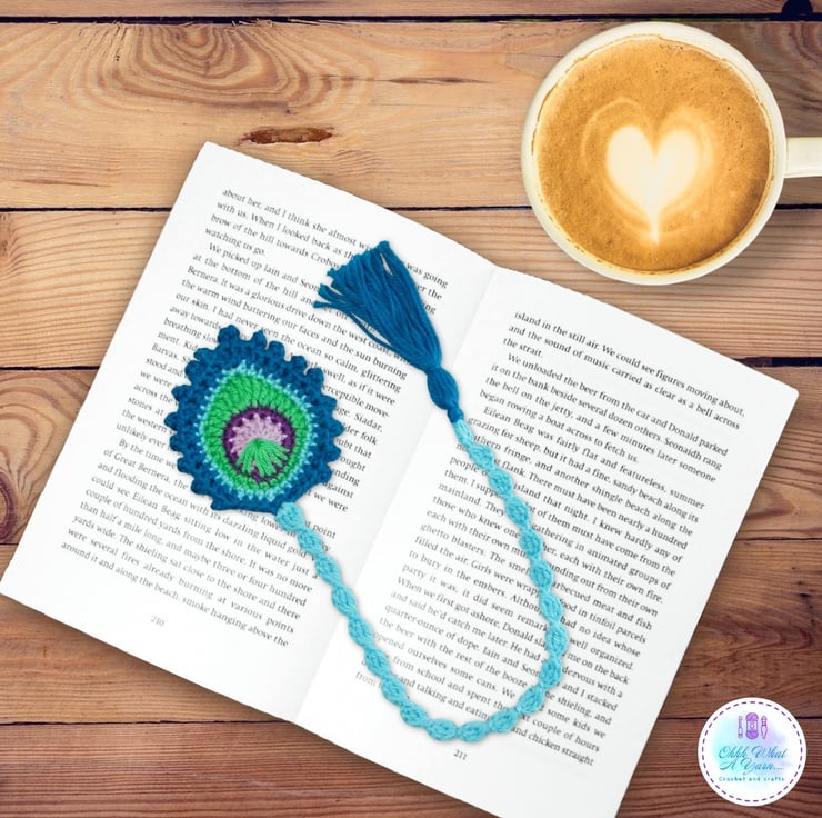 It has a crocheted fancy thong and a hand made tassel. It would be a perfect gift for peacock loving bookworms.