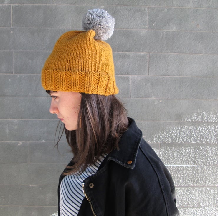 This listing is for the Bobble Hat in Dark Mustard Chunky Yarn with Light Grey Pom Pom only