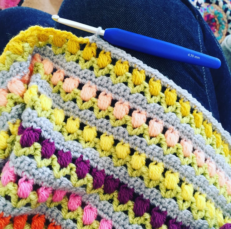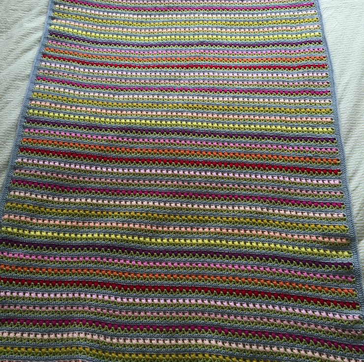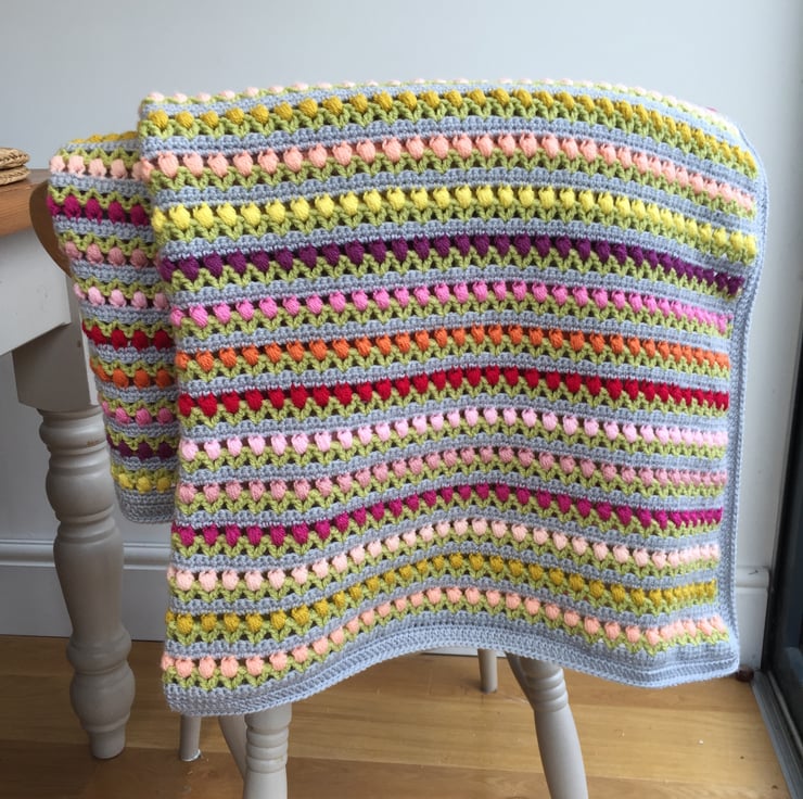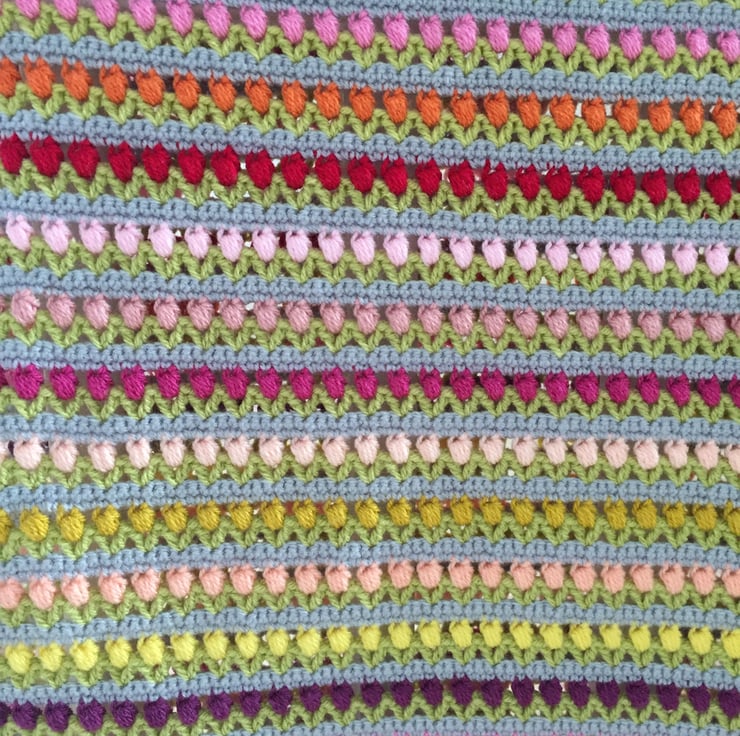 We visited the Eden Project in Cornwall in April 2017 and I was totally inspired by the fabulous display of tulips. As much as possible I've tried to recreate that display in this colourful blanket!
