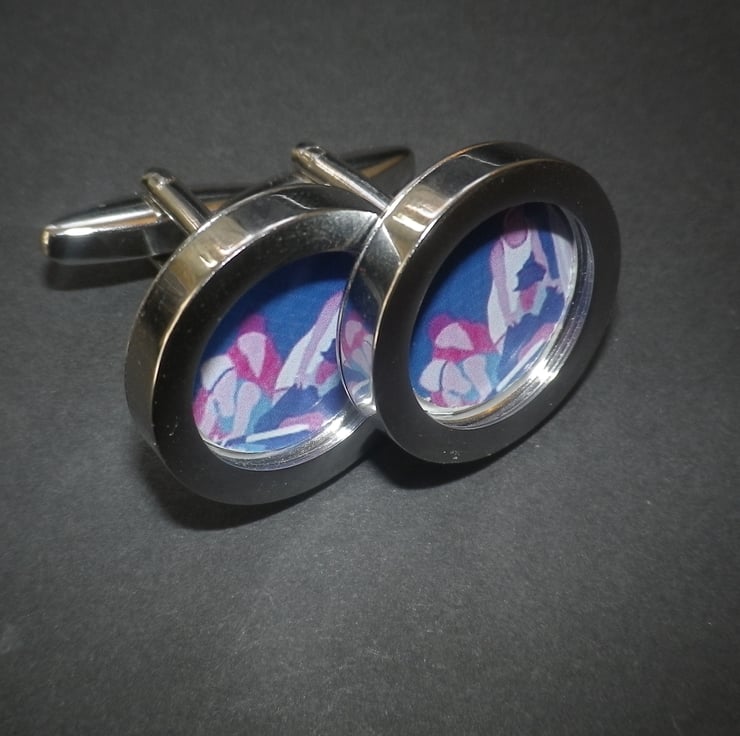 This listing is part of a small number of graphic art images chosen for their vibrancy and visual impact.The designs are highly original, stunning to look at,and the cufflinks have a highly polished silver finish with a deep setting, and a 'cigar' shaped shank for ease of use.