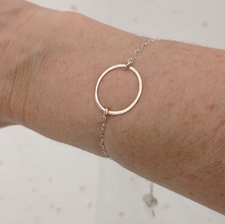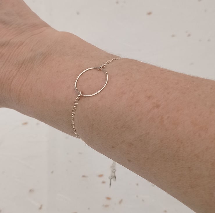 I have created this bracelet by hammering flat a sterling silver ring; after filing and finishing it was attached to chain, with tags on the ends (all in sterling silver). The chain is held together with a sterling silver sliding bead, which enables the wearer to adjust the length of the bracelet. This piece is part of a collection of minimalist bracelets, including a smaller version of this one.