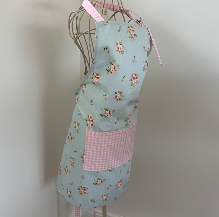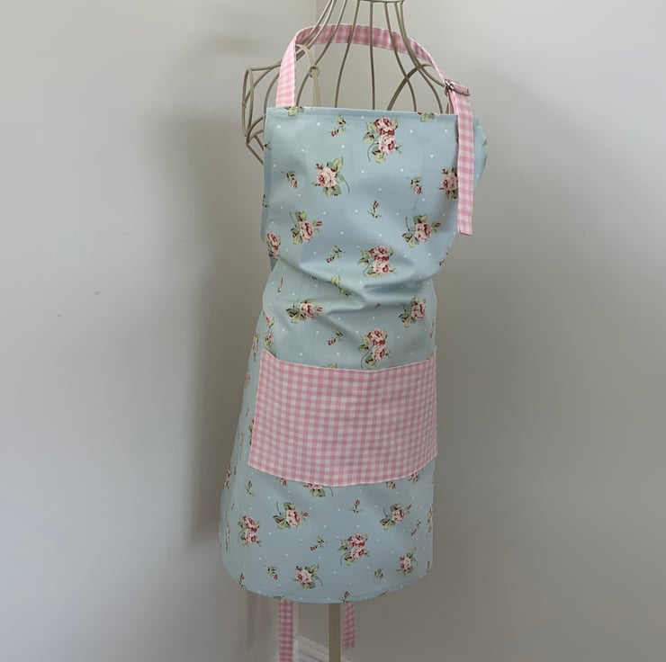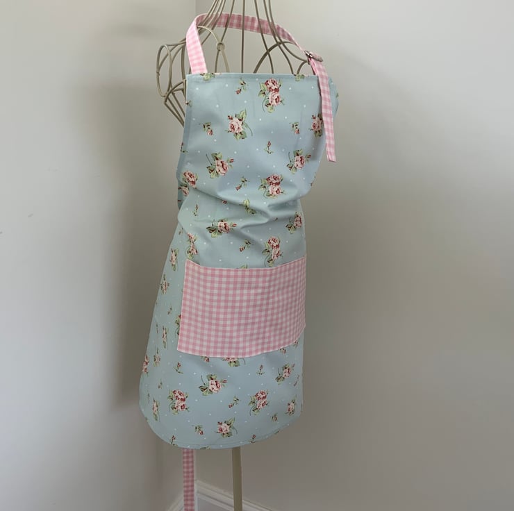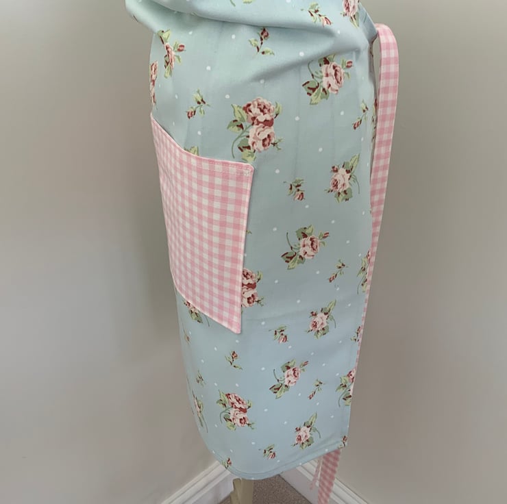 Gorgeous full apron made from 100% cotton In a pretty floral fabric. This apron has a useful lined centre pocket which is divided into two sections. It has an adjustable neck strap to fit all sizes.